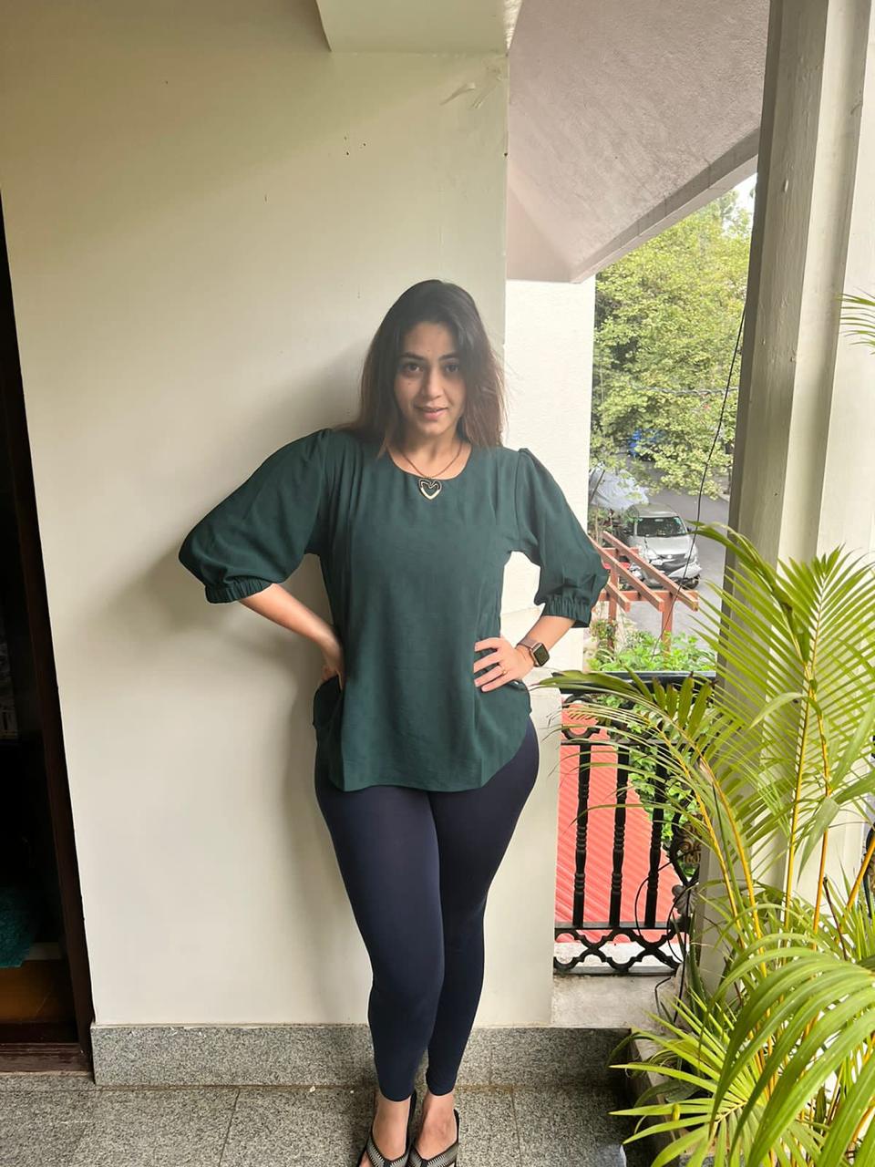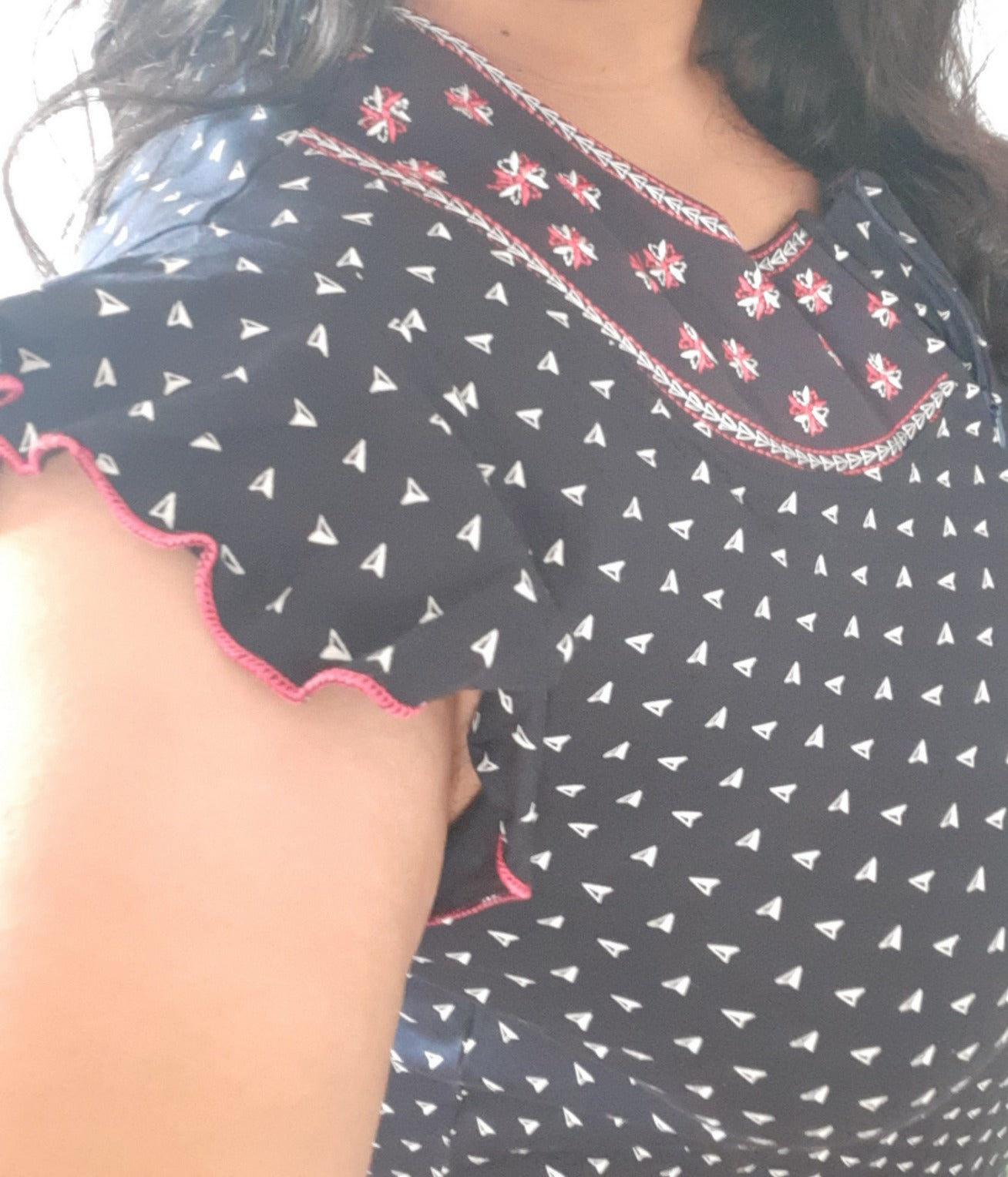 Design Details: Round neckline with button placket and dainty lace cuffed sleeves.