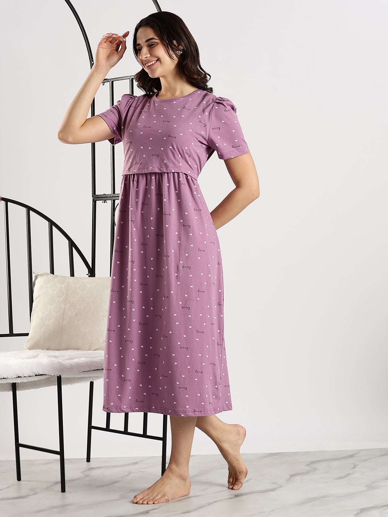 Celebrate motherhood with this lavender maternity nighty featuring delicate heart and “love” prints. Crafted from premium hosiery cotton, it offers a zipless overlap feeding layer and adjustable waist tie for growing comfort through all trimesters. Perfectly soft, stretchable, and stylish for everyday wear.