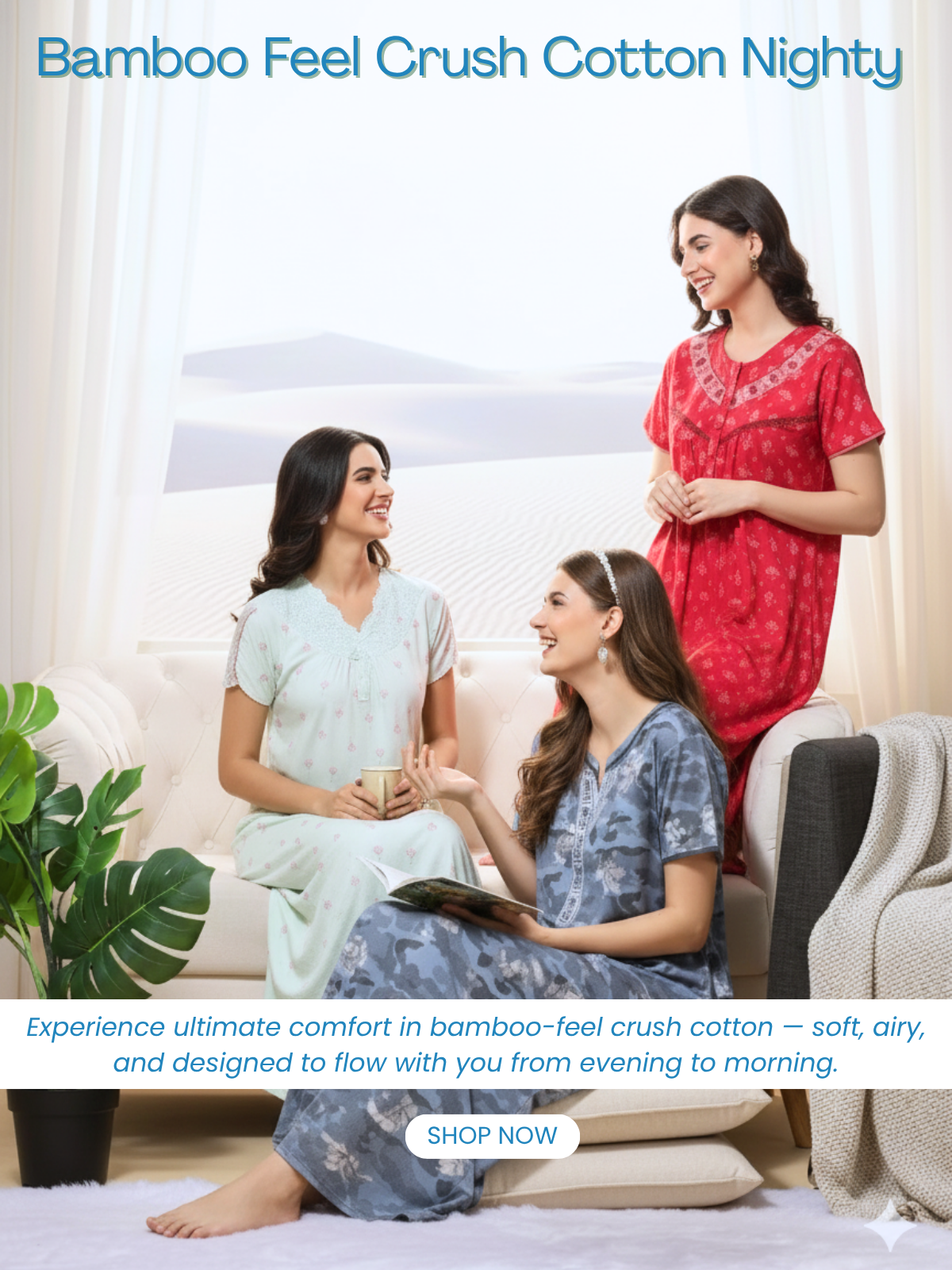 Bamboo cotton fabric is a soft, breathable blend made by combining natural bamboo fibers with cotton, creating a lightweight and moisture-wicking material perfect for daily wear. Loved for its smooth texture and eco-friendly properties, bamboo cotton is especially popular in ladies cotton nightgowns and womens nightdress cotton collections. It keeps you cool during warmer months while offering enough coziness for all-day lounging or nighttime use. With its naturally soft handfeel and gentle drape, bamboo cotton makes the ideal fabric for any night dress cotton for ladies seeking both comfort and style.