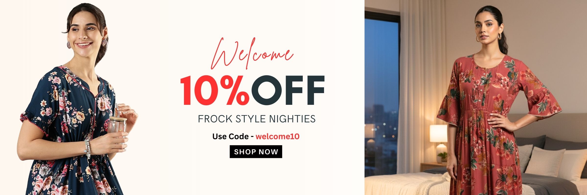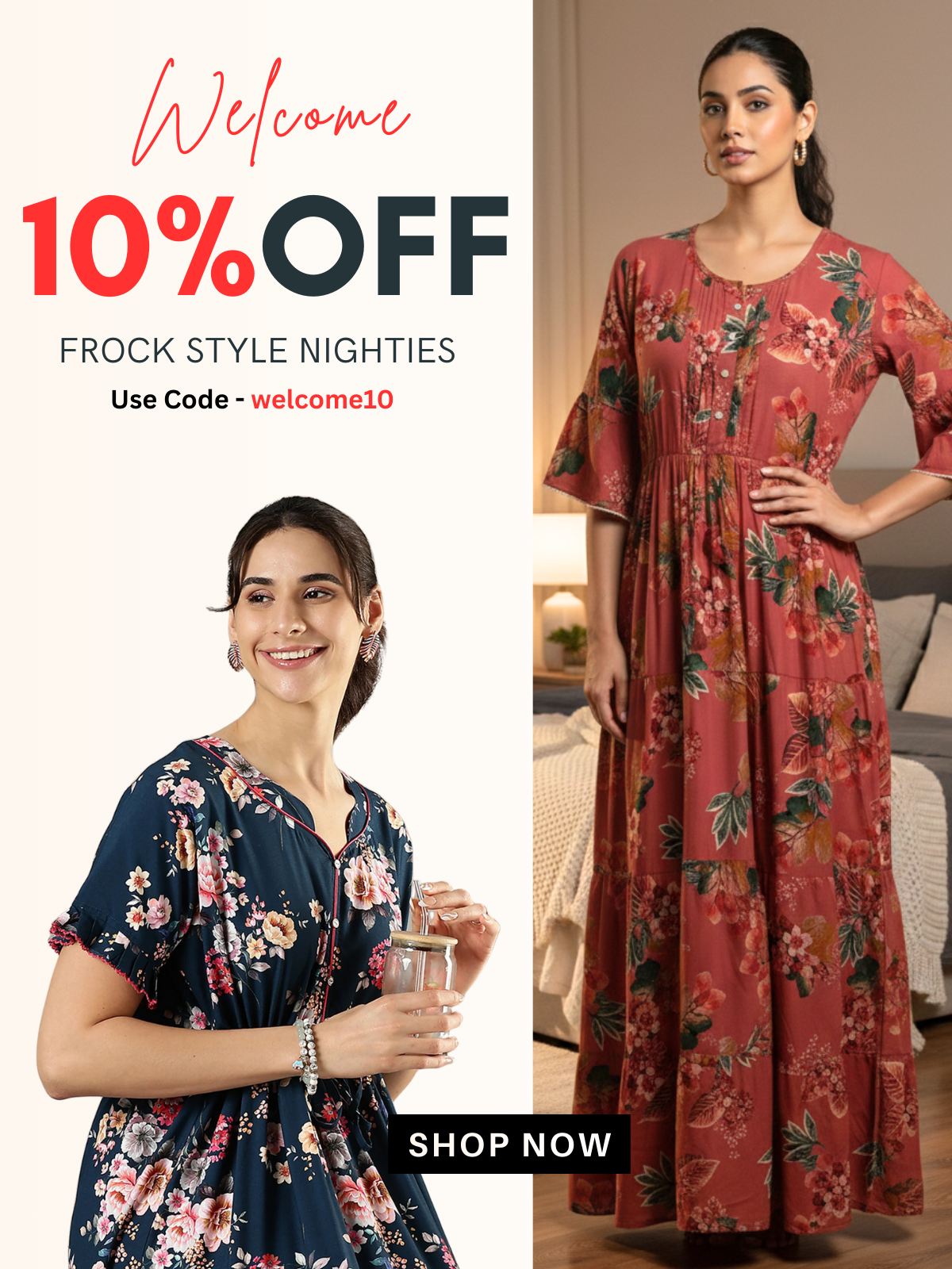 Frock type nighties are crafted from premium fabrics like rayon, alpine blends, and viscose, offering breathability, softness, and durability for lasting comfort. Designed with intricate embroidery, vibrant prints, and stylish silhouettes, these elegant nightgowns for women are perfect for lounging, sleeping, or casual outings. Thoughtful details such as drawstrings for a tailored fit, functional side pockets, and adjustable waistbands provide practicality without compromising style. For those who love flowy and versatile designs, explore our kaftan nighties, which blend elegance with comfort effortlessly. With a versatile appeal that enhances your wardrobe, our frock-style nightgowns cater to various occasions and are available in a wide range of sizes, including plus sizes, ensuring a perfect fit for every body type.