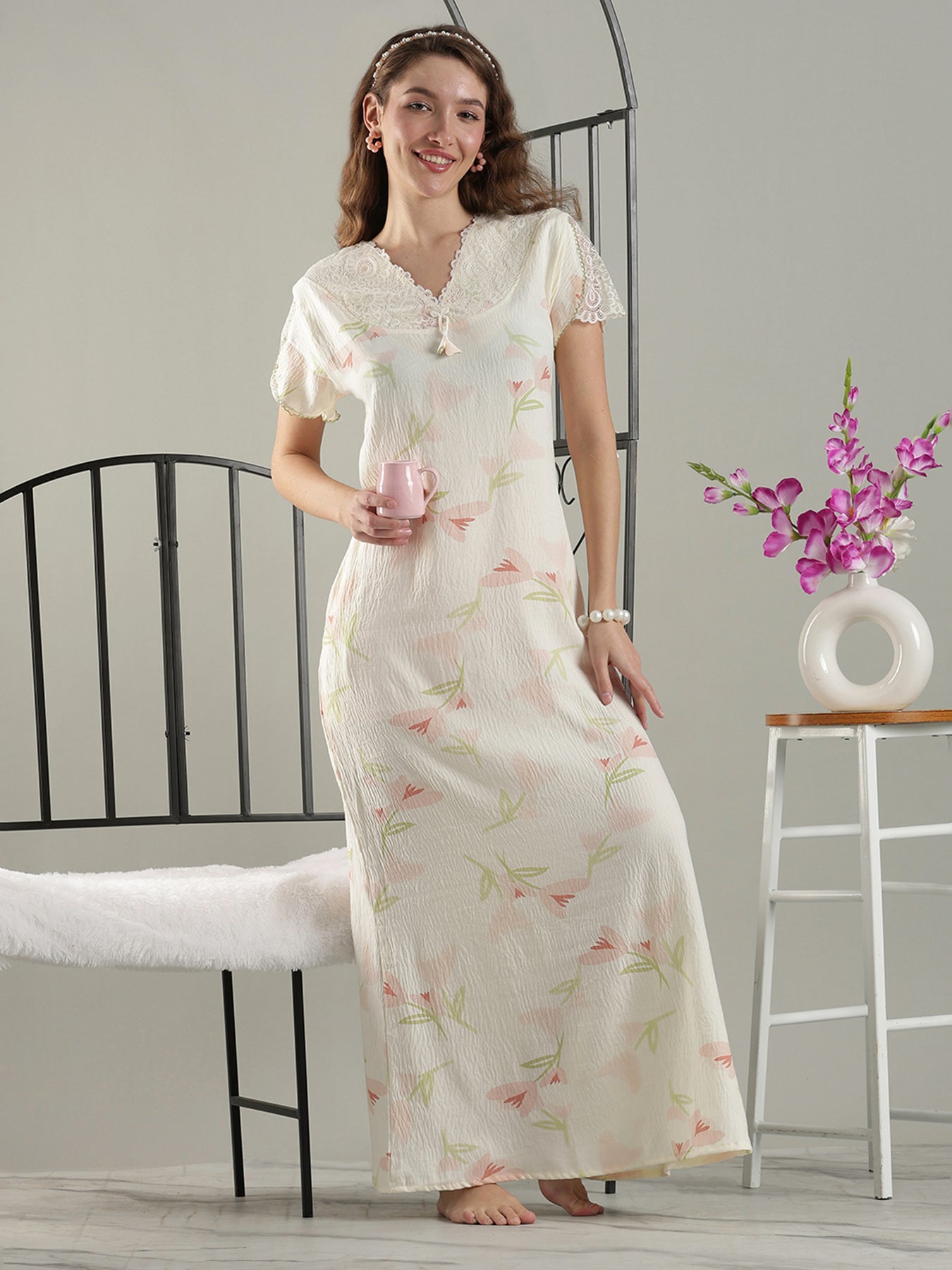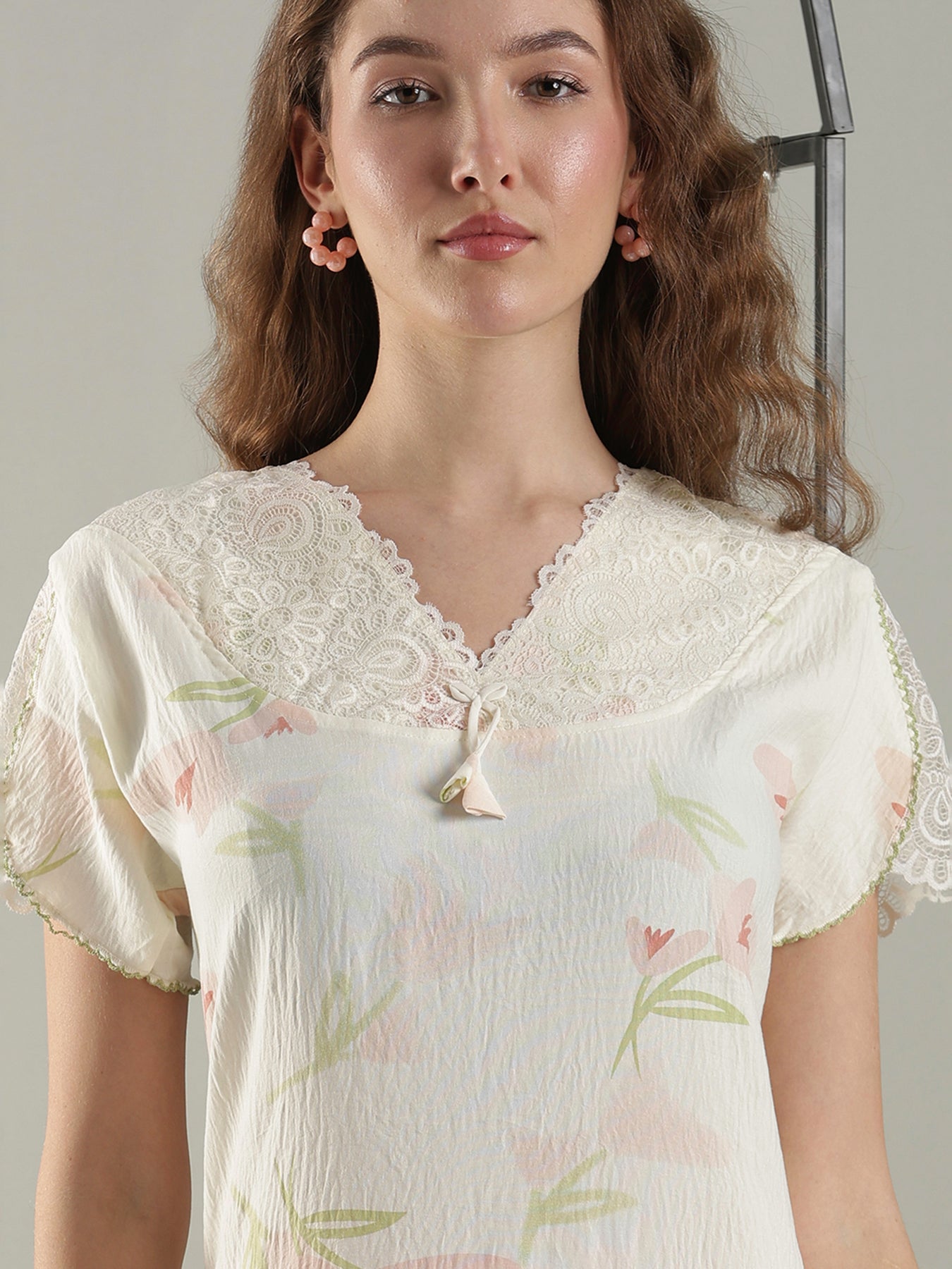 The floral pastel print blends beautifully with the soft yellow base, while the lace detailed V neckline and flutter sleeves add a feminine, graceful touch for everyday home wear.