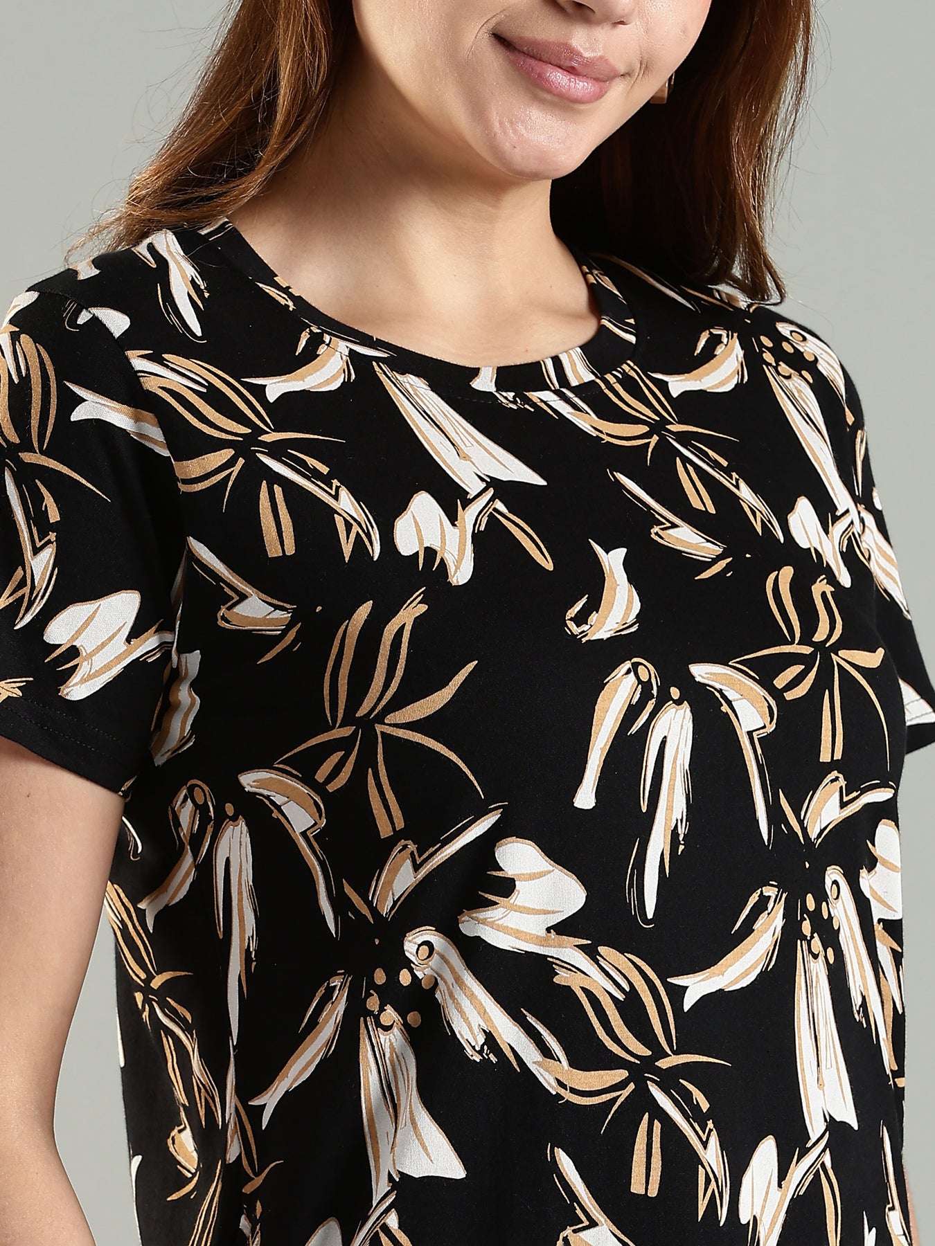 Abstract Beige Floral Cotton Short Nightdress for Women Soft Stretchable