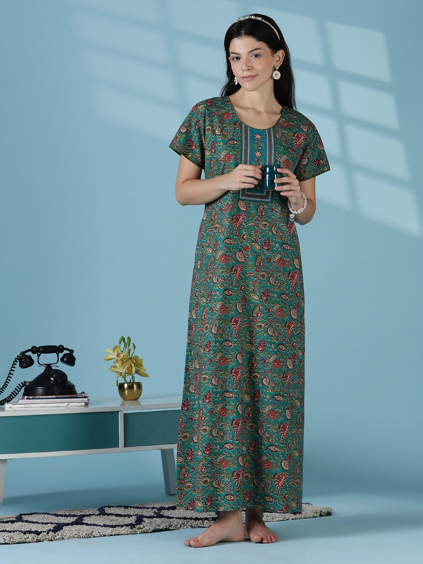 Aster Teal Pure Cotton Nighty – Cool Comfort with Stylish Prints