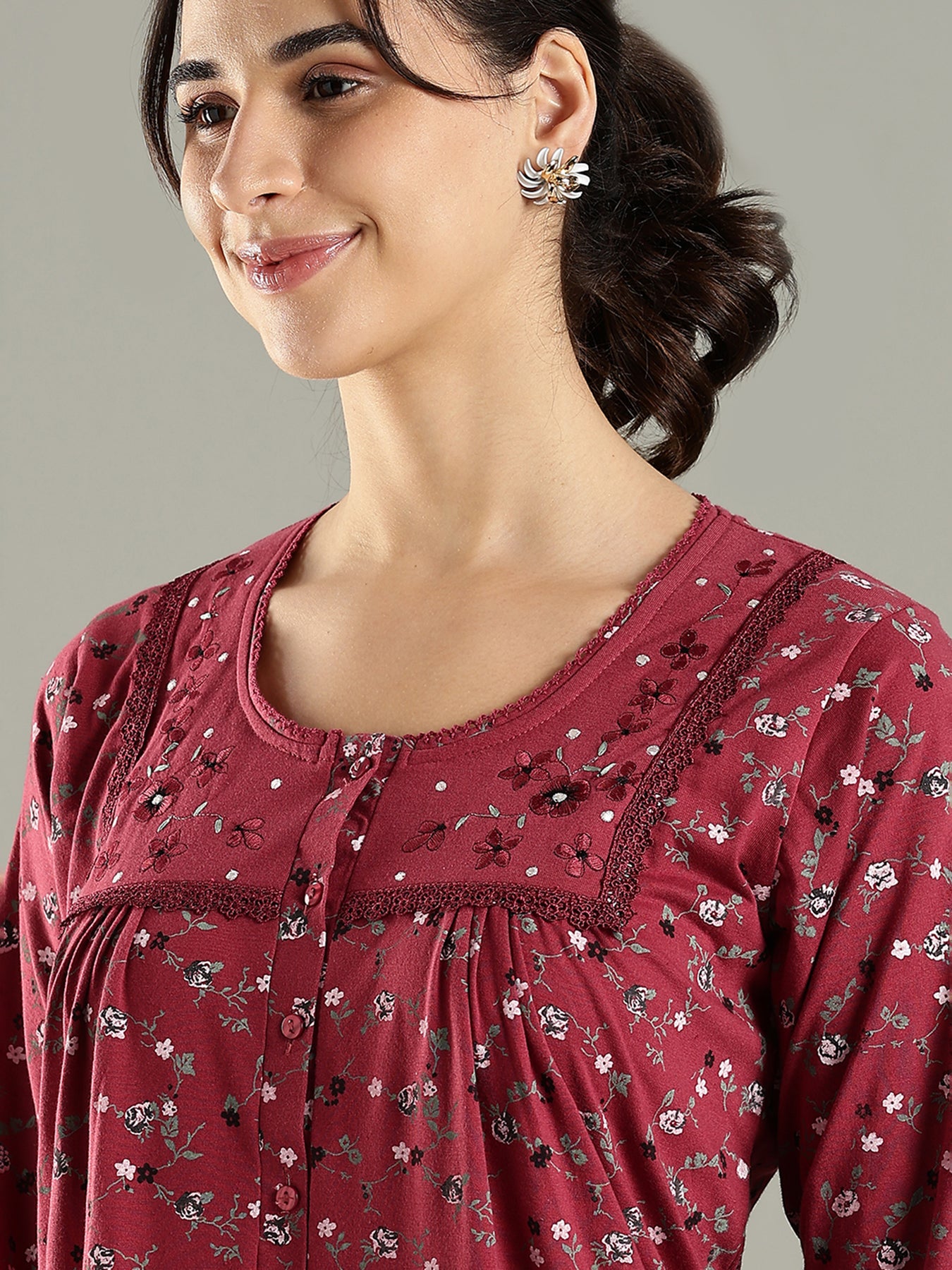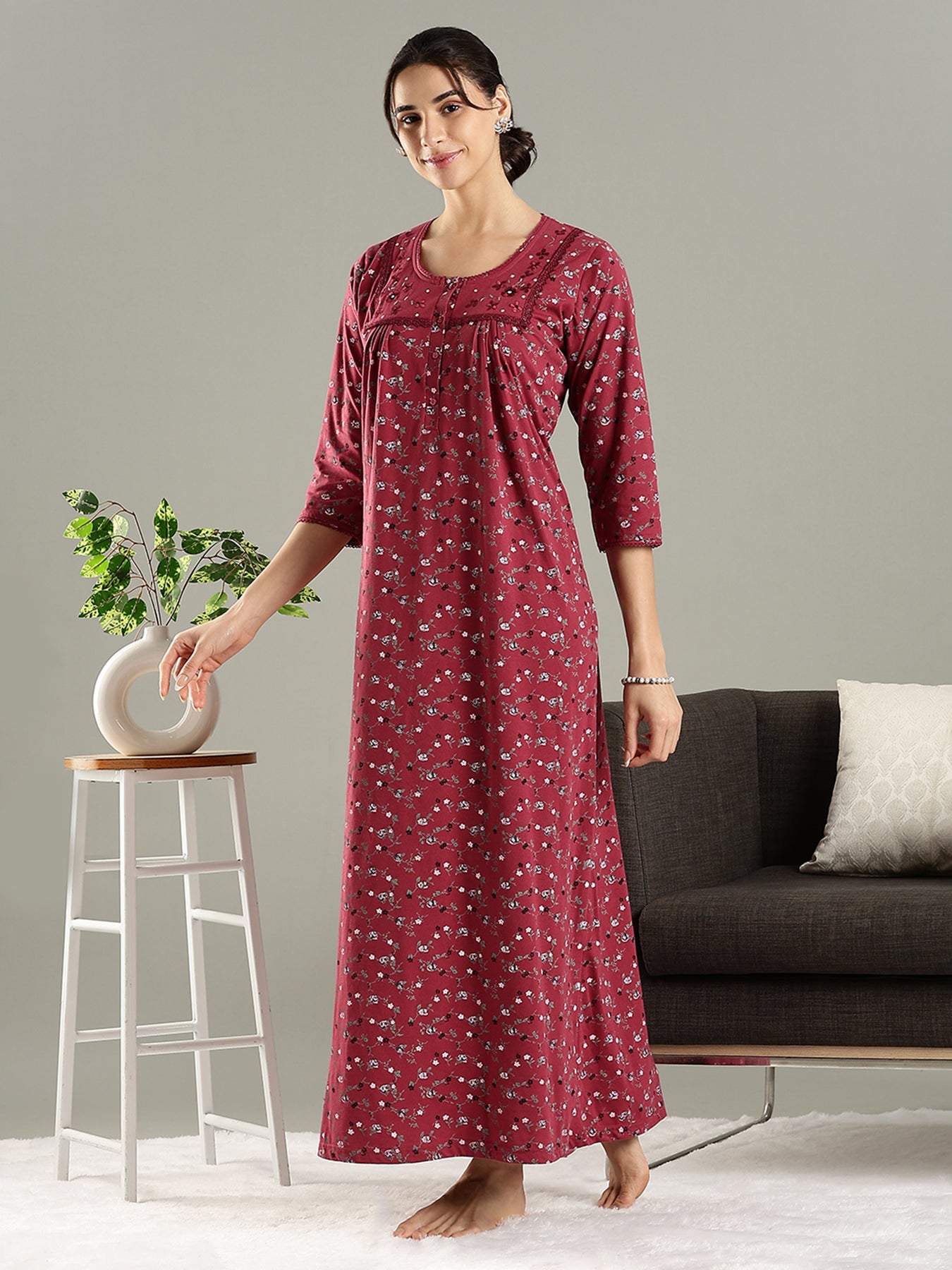 Embrace everyday sophistication with the Berry Cran Cotton Blend Designer Nighty. Featuring a rich hue and floral pattern, it balances elegance with comfort, while the embroidered yoke provides a subtle handcrafted detail. The breathable cotton blend ensures coolness, and the pleated yoke creates a flattering, flowing silhouette for all body types. Designed with 3/4 sleeves, a practical button placket, and a convenient side pocket, it prioritizes comfort without sacrificing style. Ideal for relaxing at home, remote work, or unwinding after a busy day, this nighty combines warmth, style, and functionality.