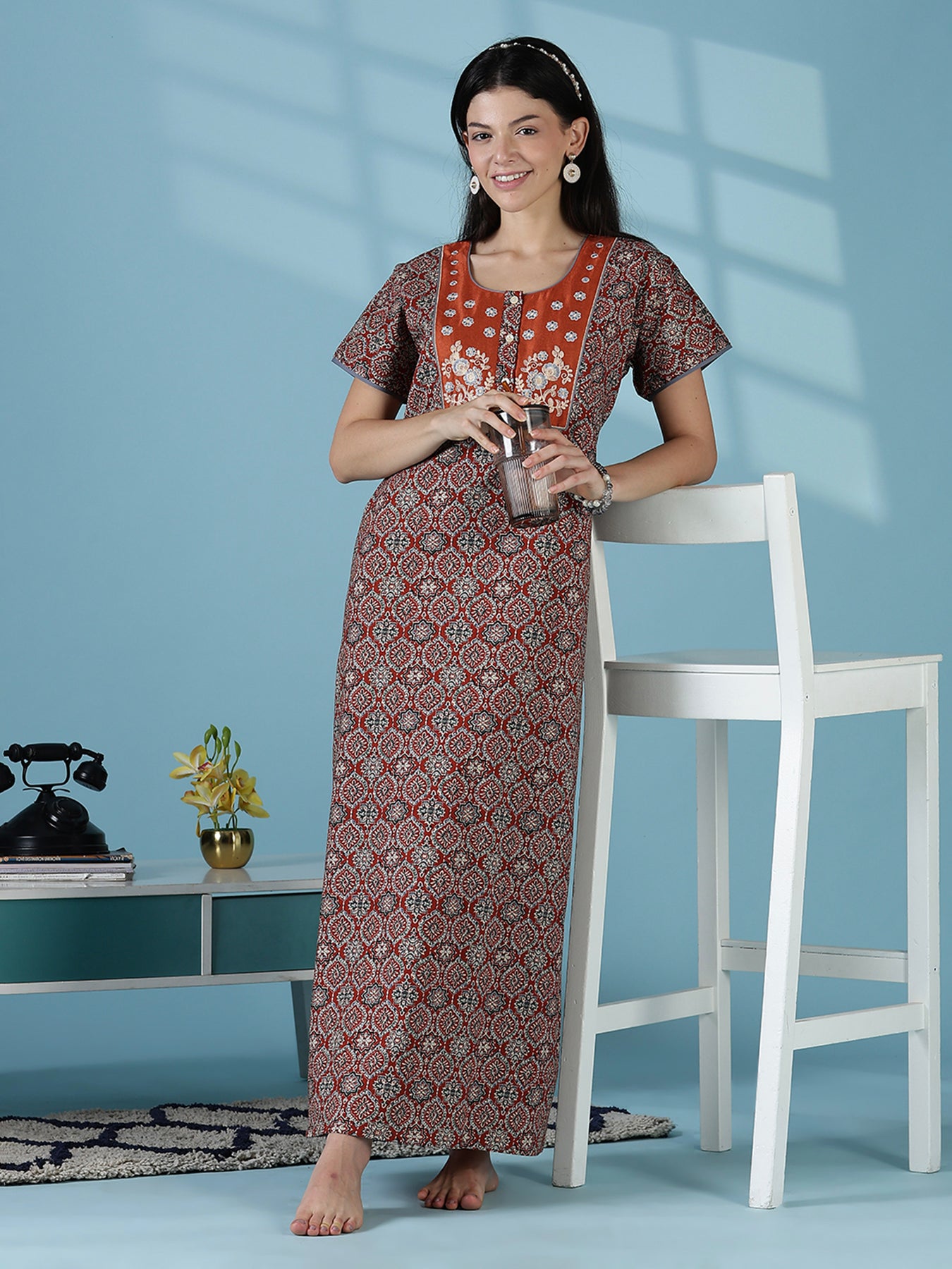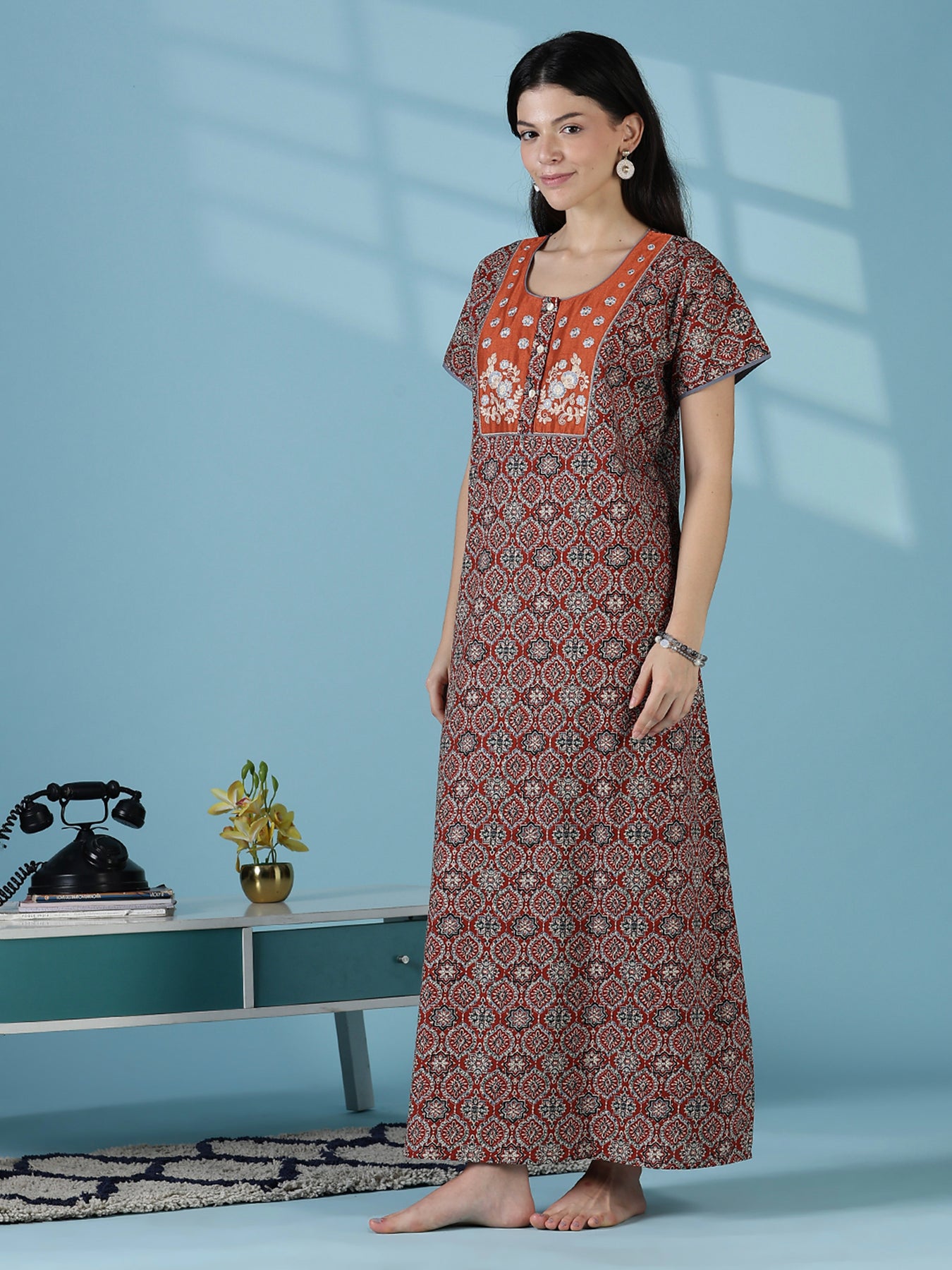 Pure Cotton Medallion Terracotta Nighty for Women Ethnic Printed