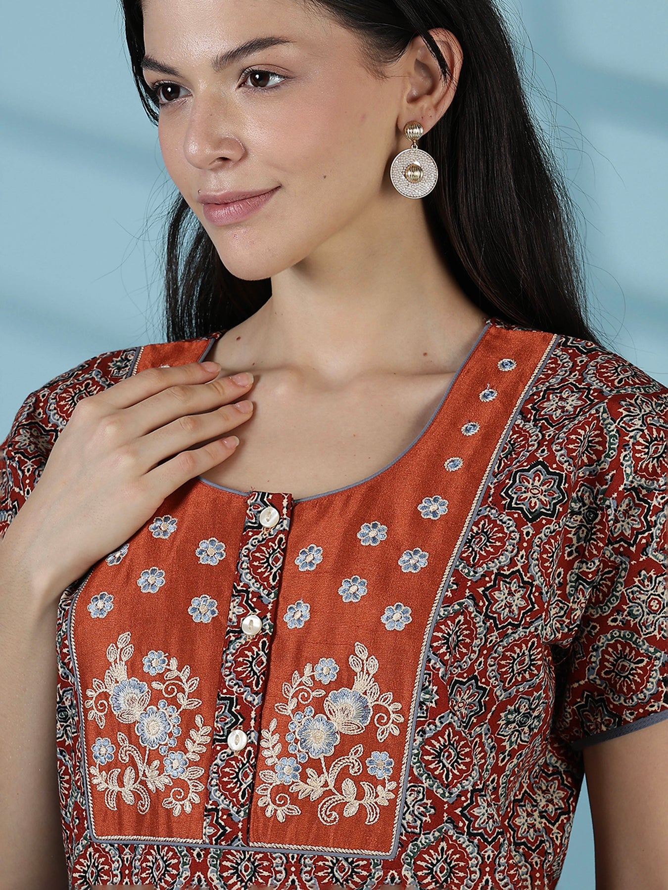 Upgrade your daily wear with this pure cotton nighty for women, featuring rich terracotta tones and traditional ethnic motifs. Designed with a flattering A-line silhouette, it offers effortless movement and unmatched comfort for both lounging and restful nights.