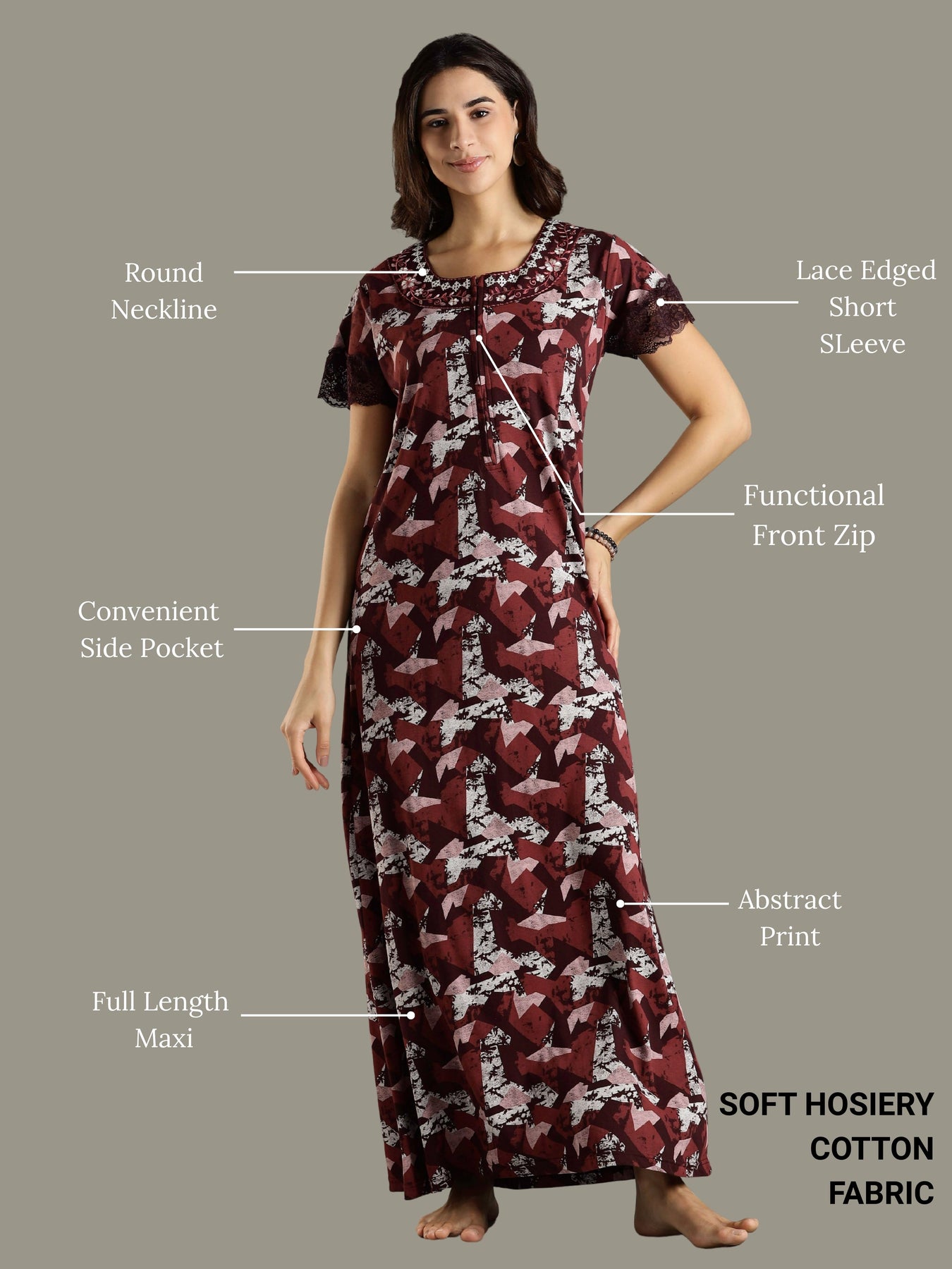 The Abstract Red hosiery cotton nighty is bold, stylish, and made for women who love to stand out while staying comfortable. Its unique abstract print sets it apart, while the soft hosiery cotton ensures breathability and gentle stretch. The 12-inch front zip makes it highly practical, especially for feeding mothers, while the embroidered neckline adds elegance. Lace-edged sleeves give a delicate finish, making it both functional and fashionable. Moms prefer this shade because red brings energy and positivity, while the abstract print keeps it forgiving and easy to wear daily.