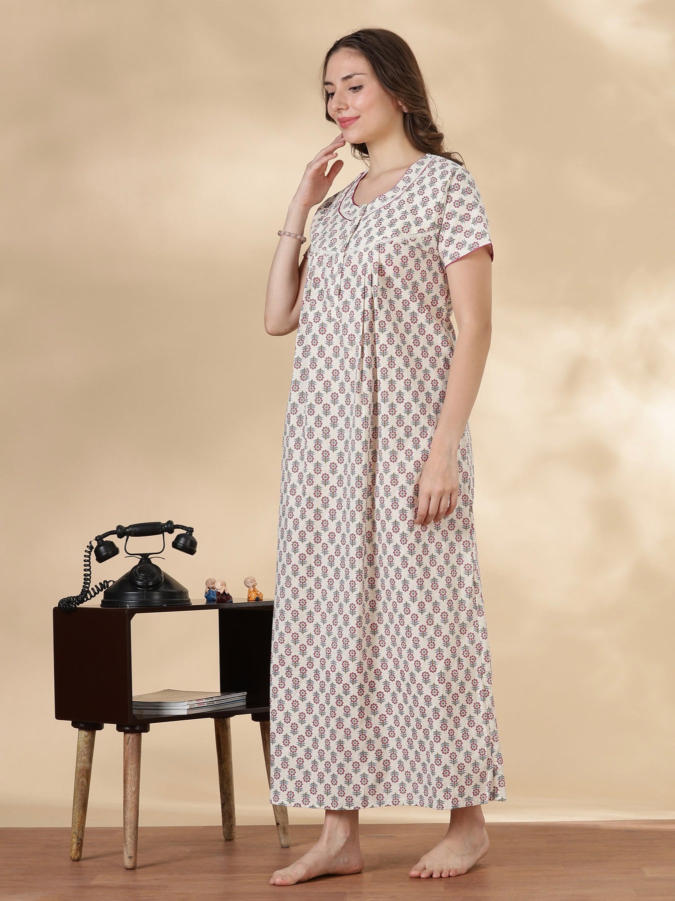 This pure cotton nighty for women features a soothing lilac floral print that brings calmness and style together. Designed for everyday wear, it offers breathable comfort and a relaxed silhouette perfect for lounging or sleeping.