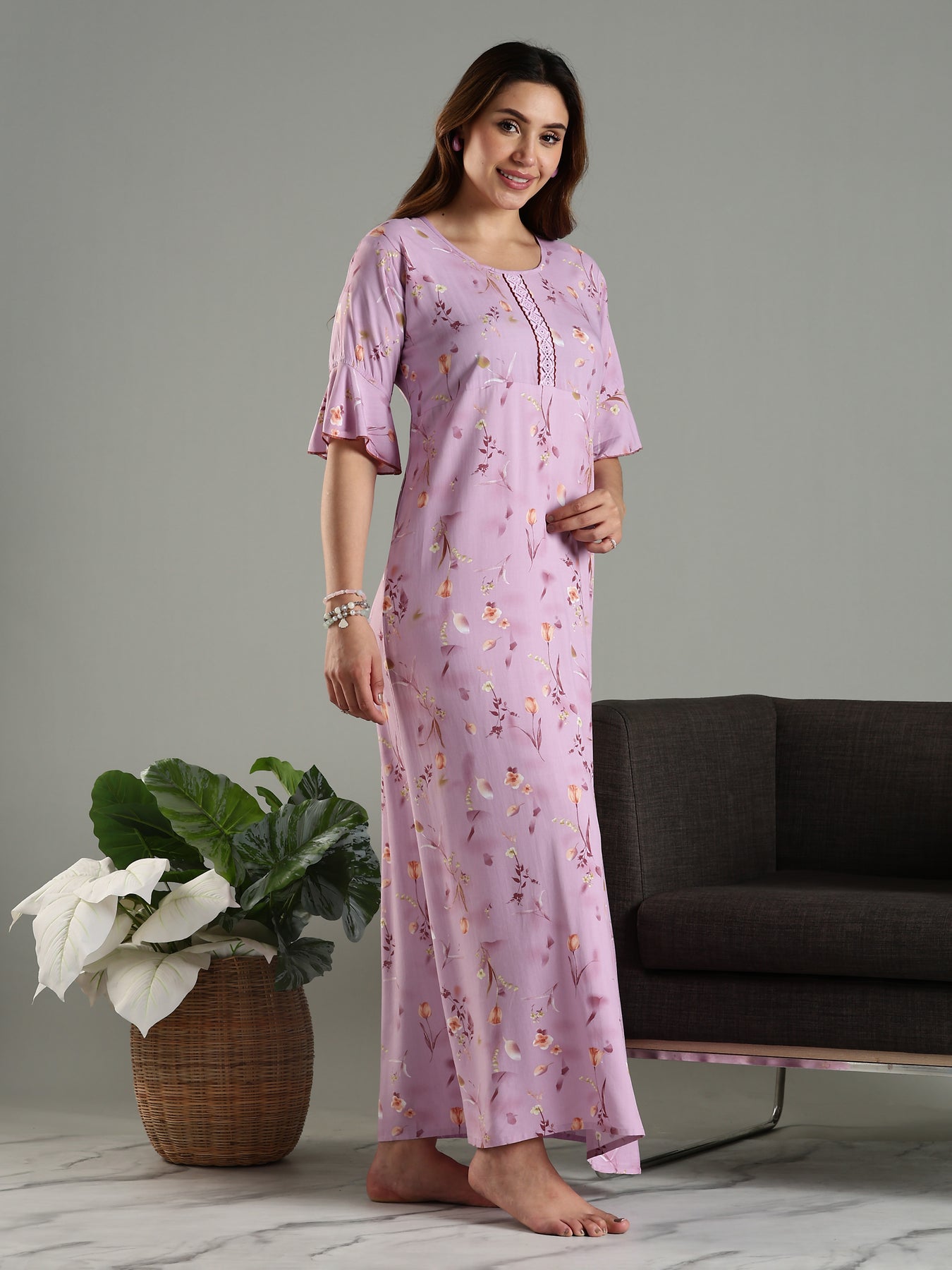 Light Purple Rayon Nightdress with Floral Prints and 3/4 Sleeves
