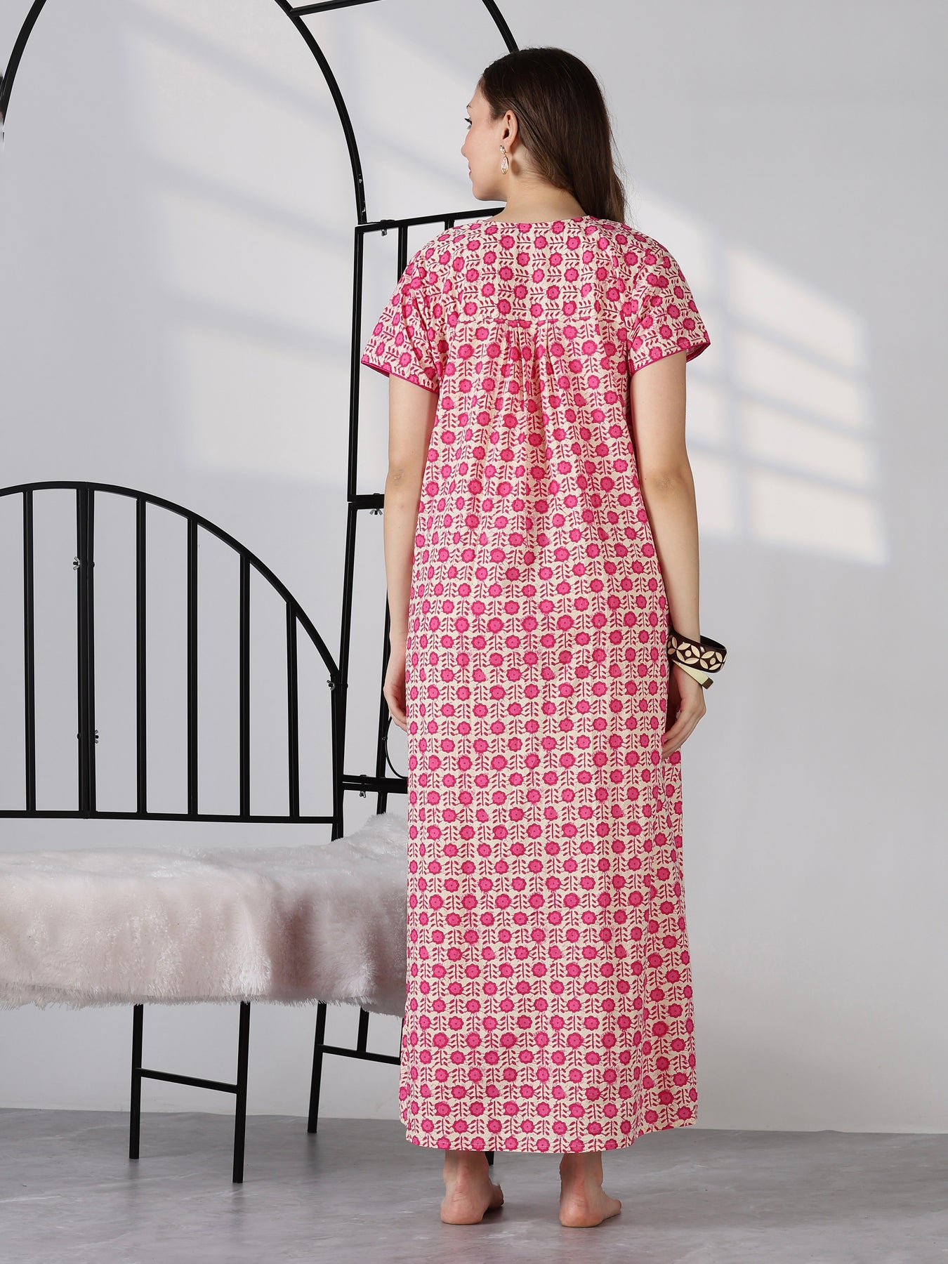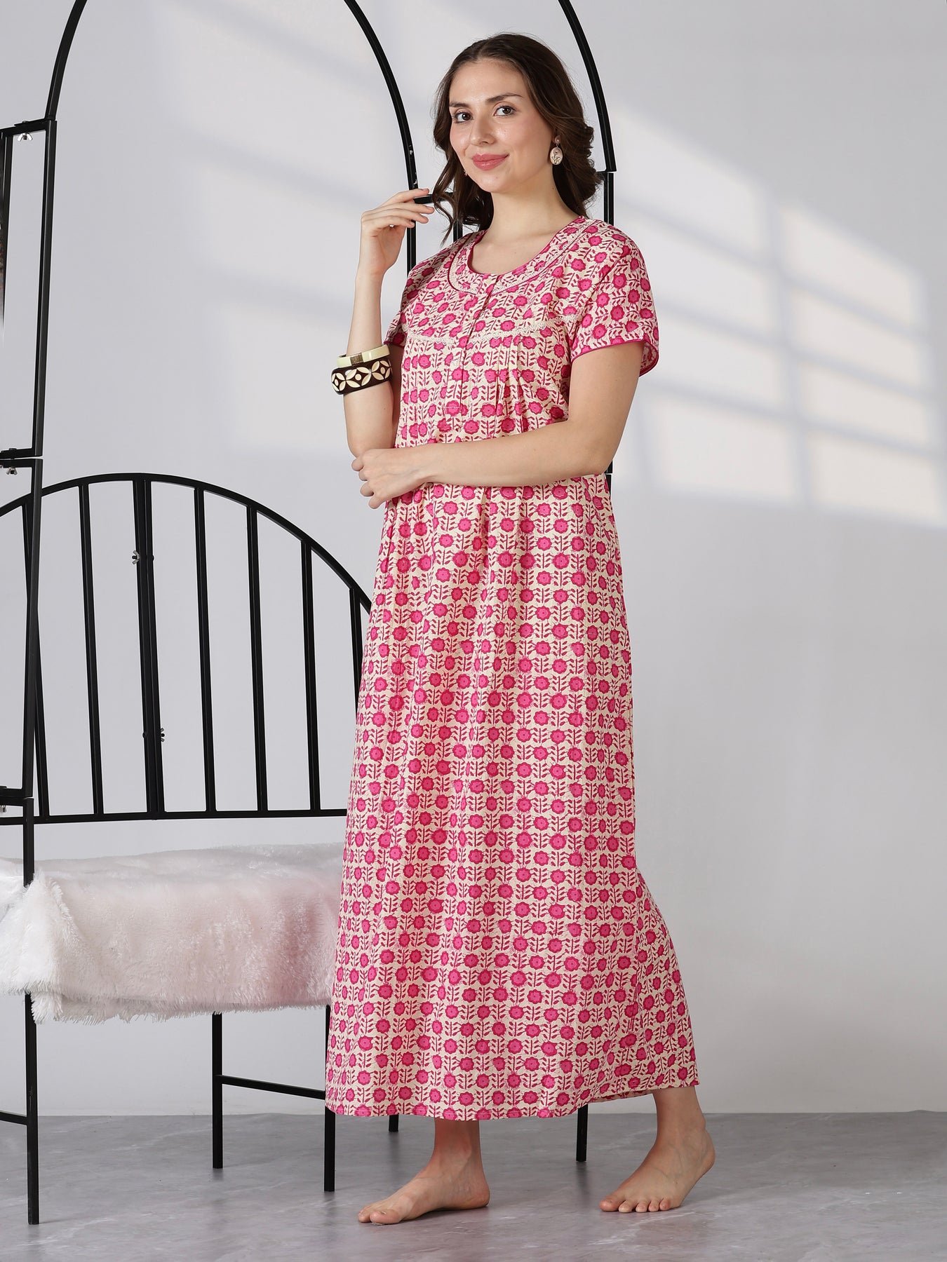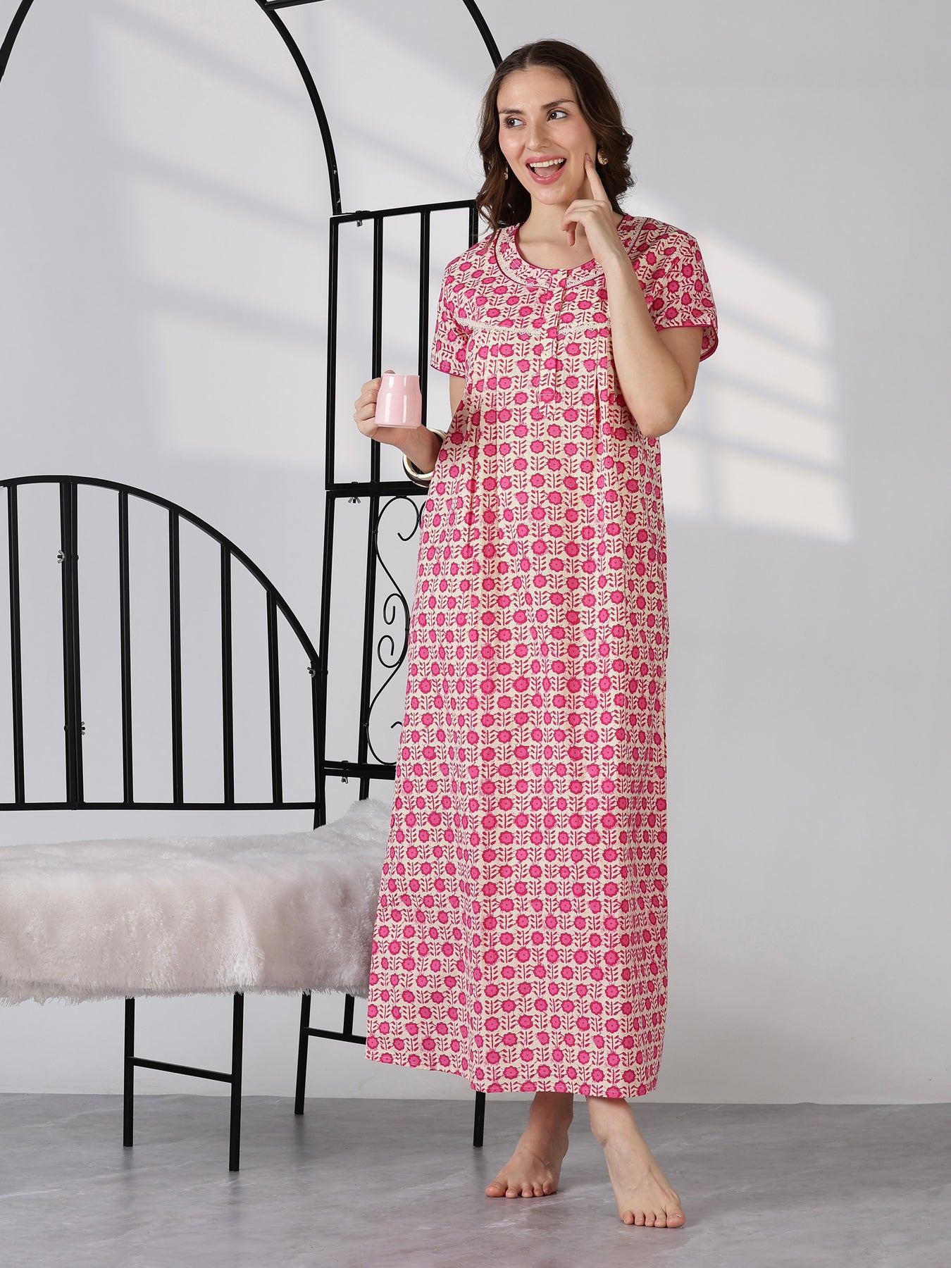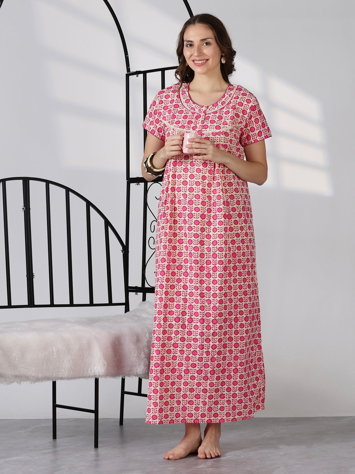 Pink Floral Pure Cotton Soft Breathable Night Dress for Women