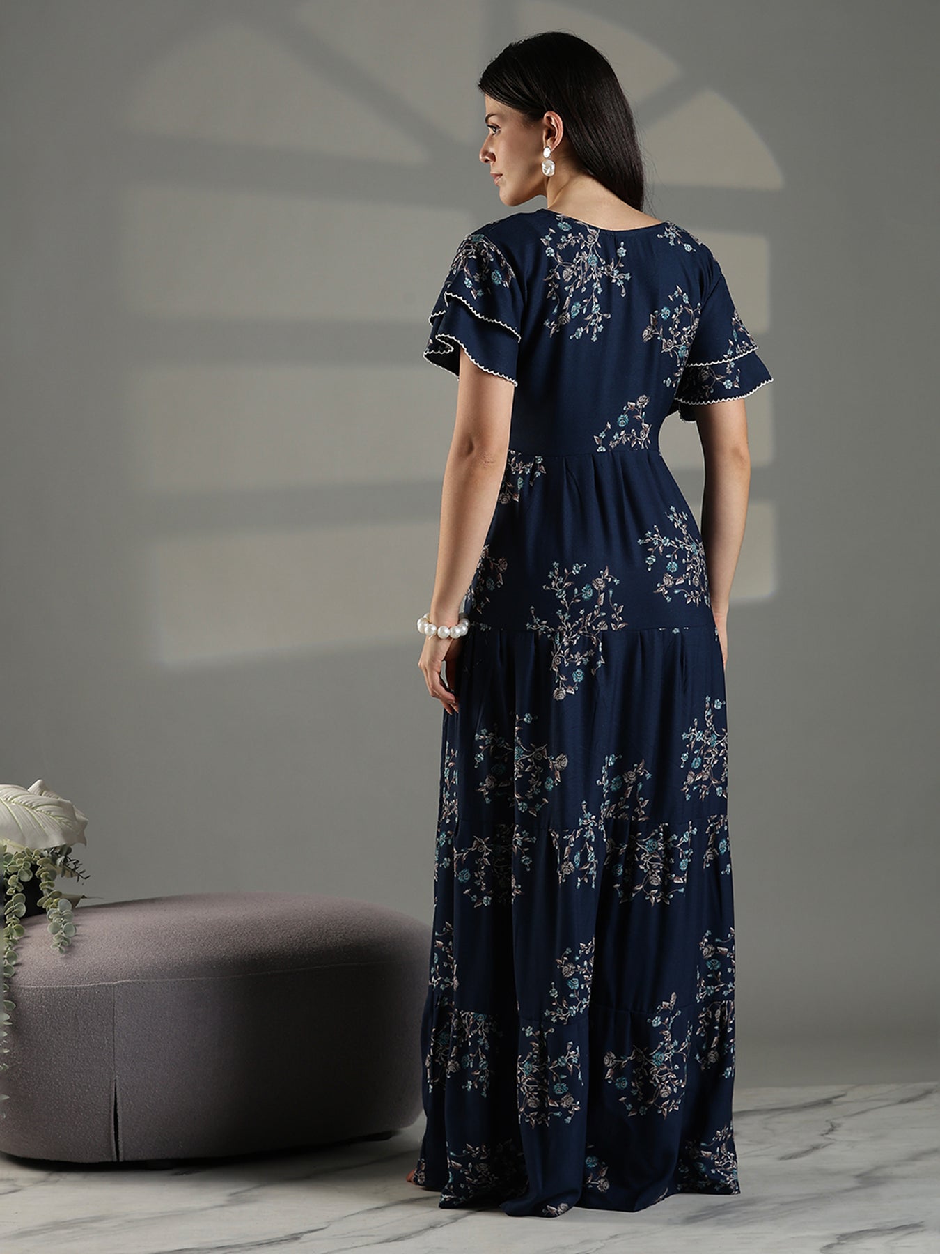 Navy Blue Floral Frock Type Nighty for Women Breathable Alpine Fabric