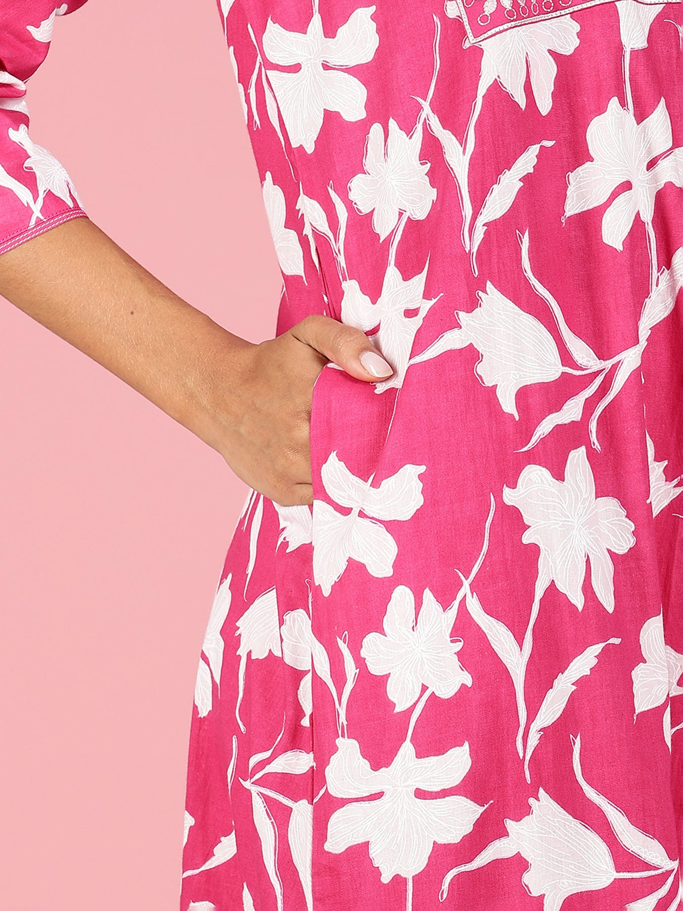 Charming Pink Jaipuri Pure Cotton Nighty with Floral Design and Side Pocket