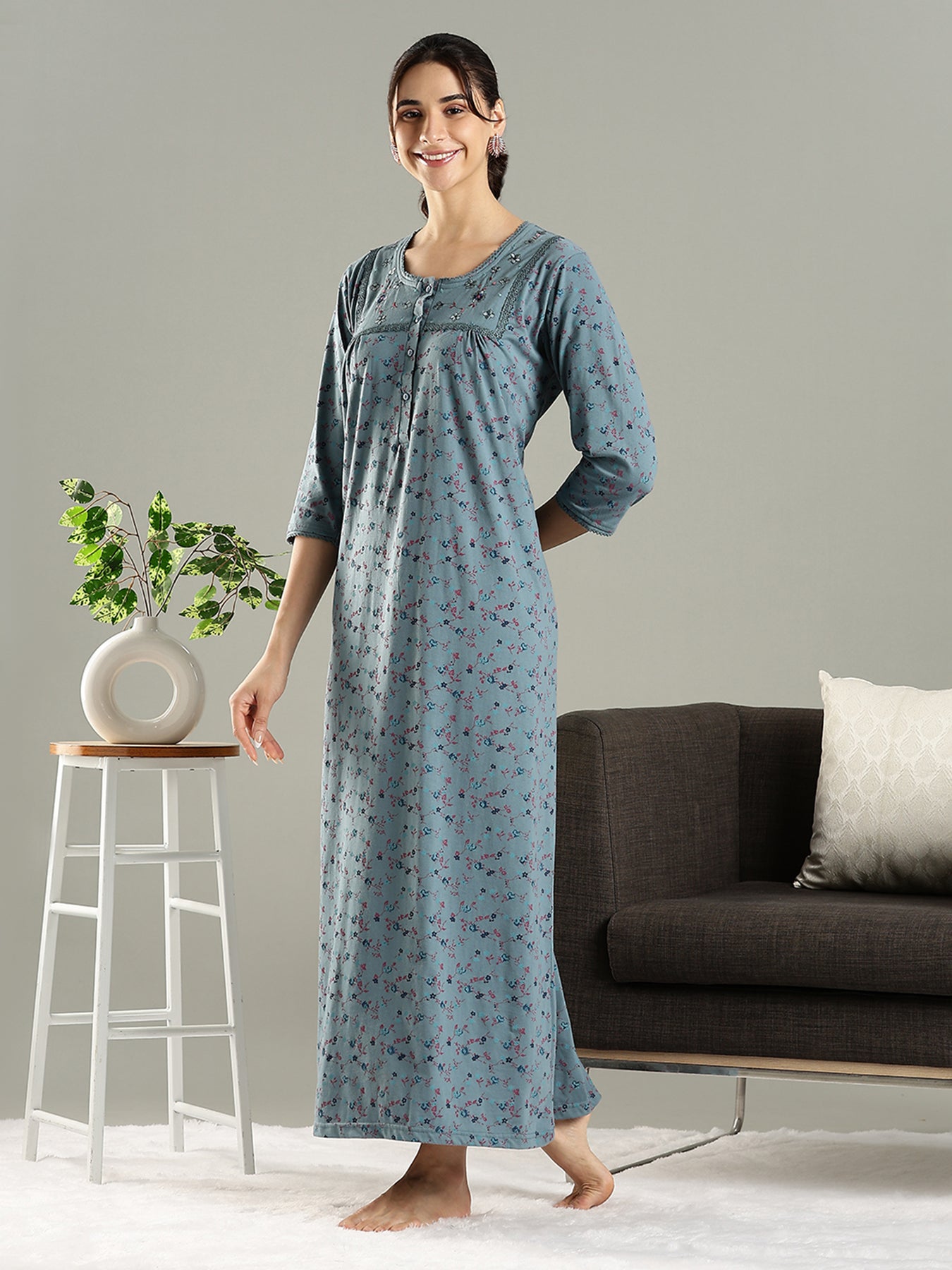 Discover enduring elegance with the Smoky Teal Cotton Blend Nighty, expertly crafted to merge comfort with style. Its soothing teal shade is complemented by delicate floral embroidery and lace embellishments on the front yoke, offering a subtle yet refined look. The pleated design promotes graceful movement and suits every body shape. Made from a breathable cotton blend, it feels soft against the skin and retains its quality wash after wash. Featuring 3/4 sleeves for seasonal adaptability, a practical button placket, and a convenient side pocket, this nighty is both functional and stylish. Ideal for relaxing, reading, or restful sleep, it provides lasting comfort and poise.