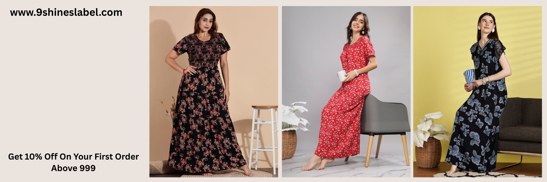 A6: 9shines Label offers long nighties, button-down frock styles, A-line designs, maxi dresses, and more. Each style is crafted to balance cozy comfort and chic design.
