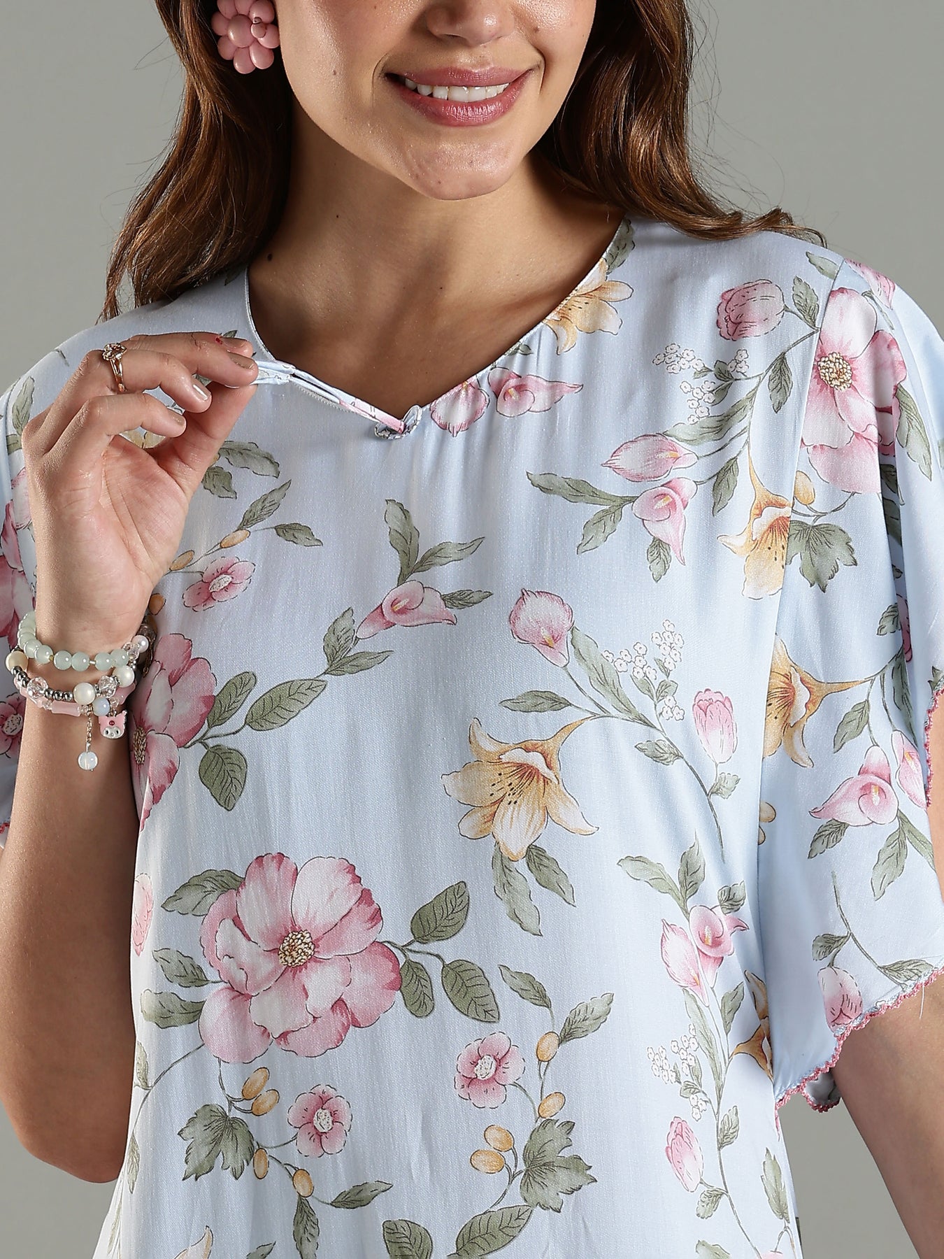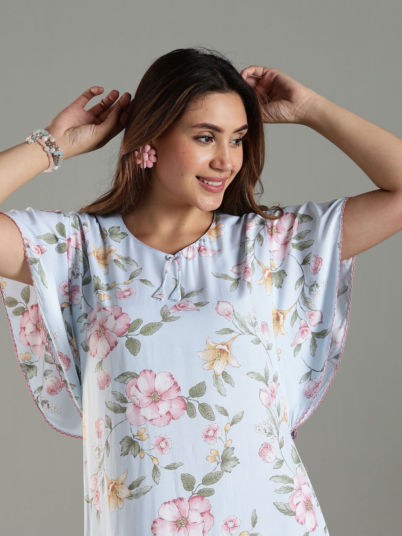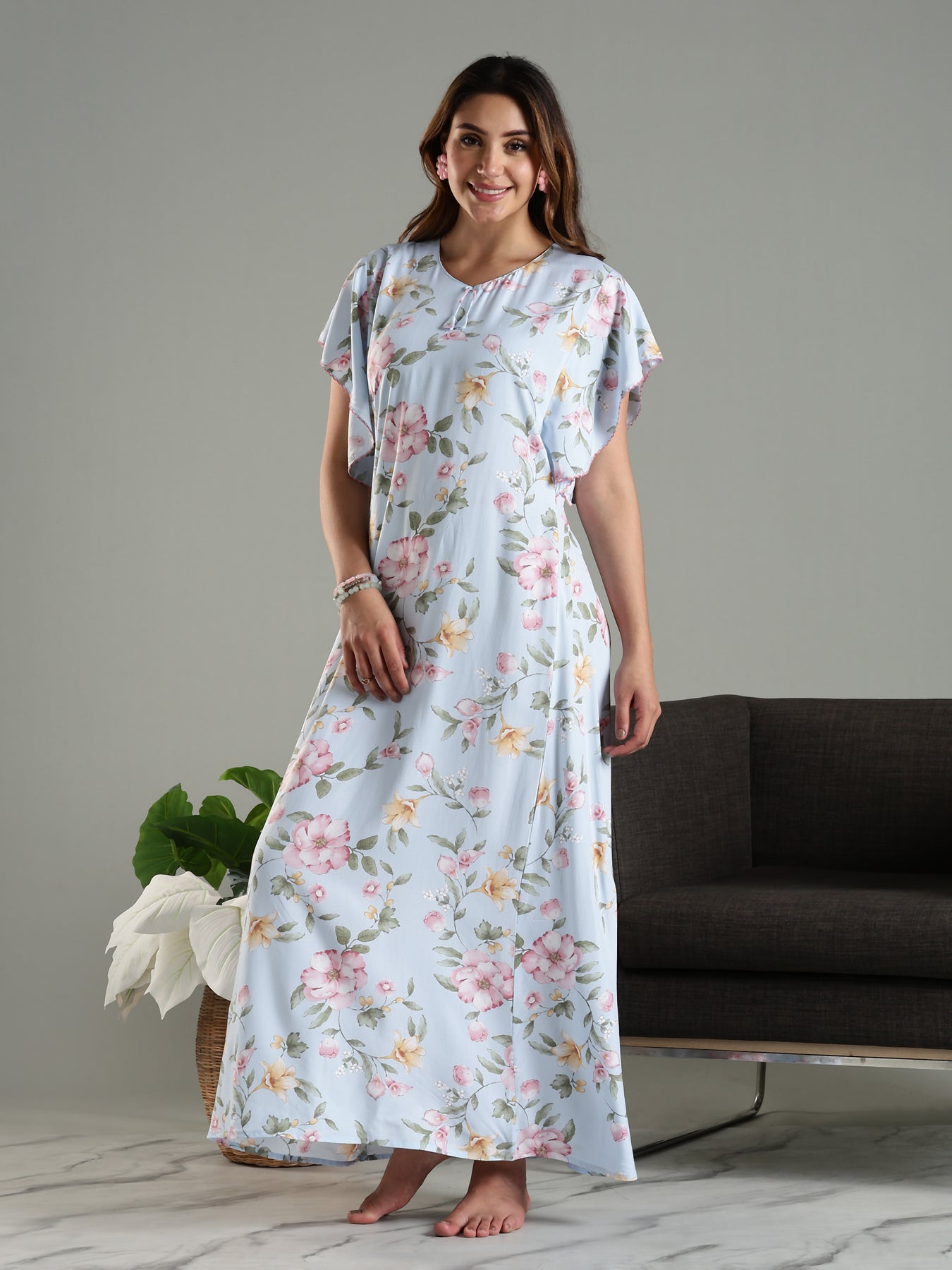 Blue Floral Rayon Maxi Nighty Dress for Women with Kaftan Sleeves and Pocket