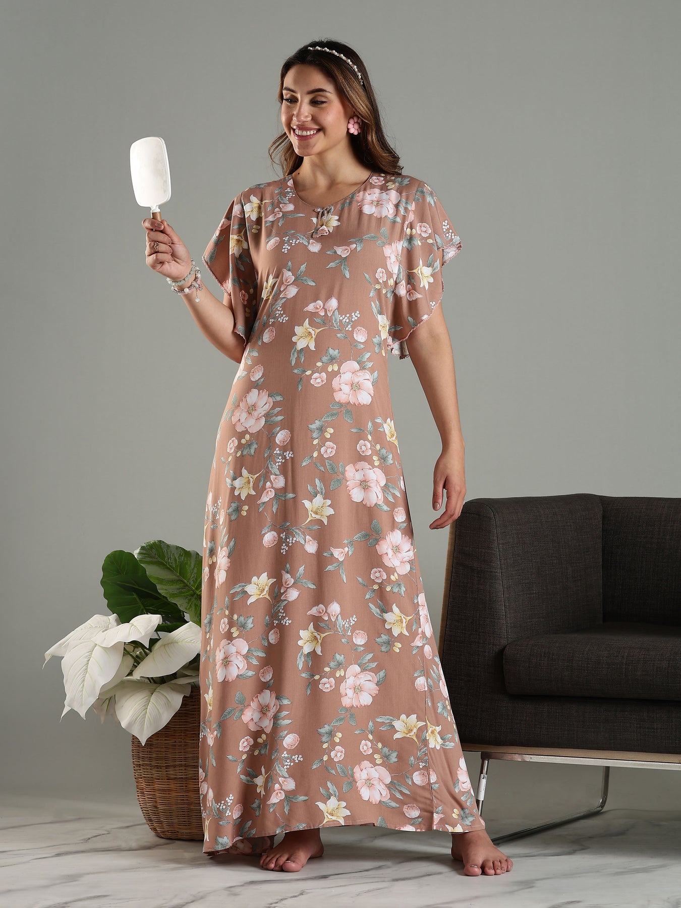 Brown Floral Rayon Frock Nighty for Women with Kaftan Sleeves and Pocket