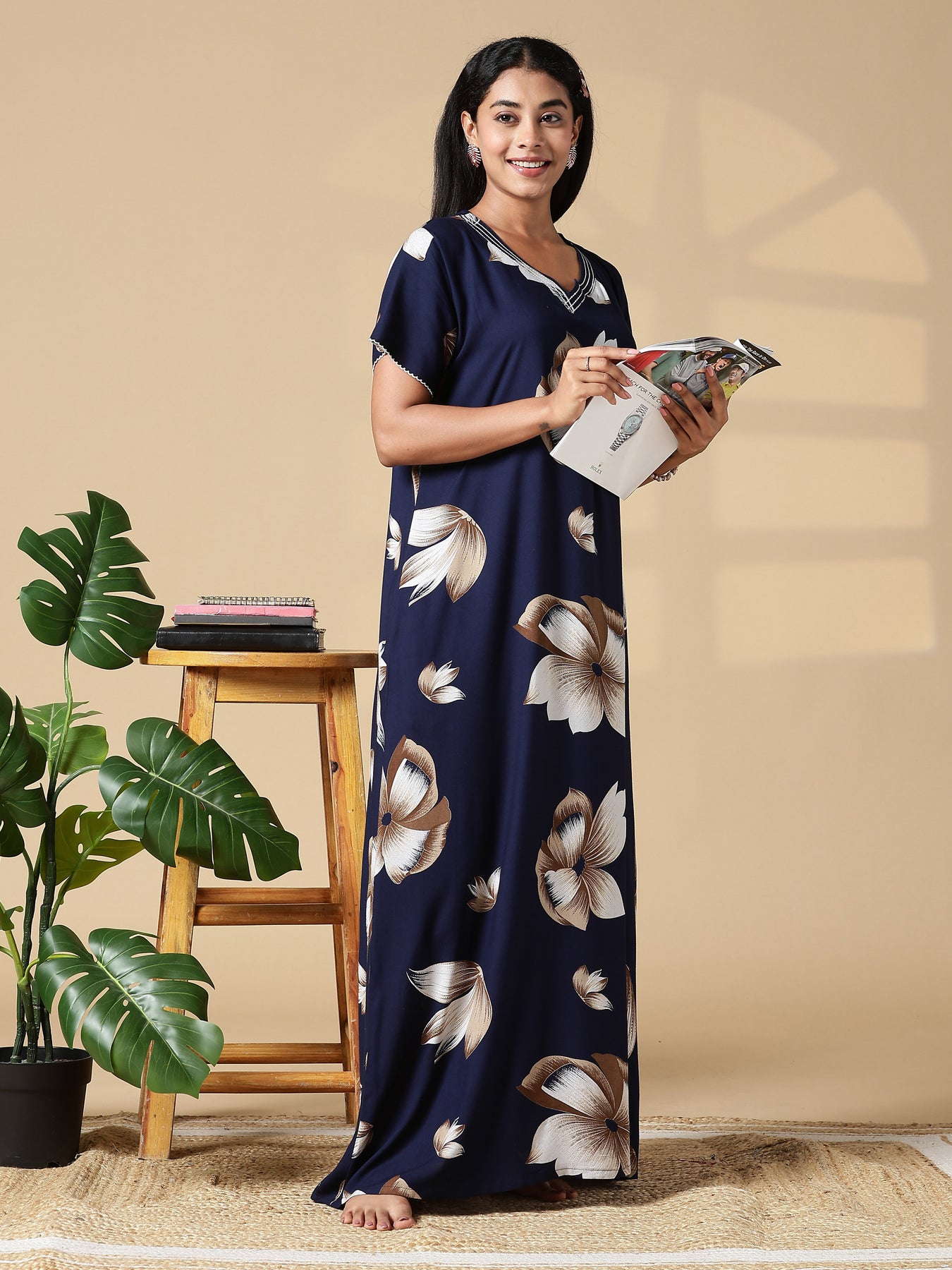 Floral Dark Blue Rayon Nighty for Women with Soft Summer Fabric
