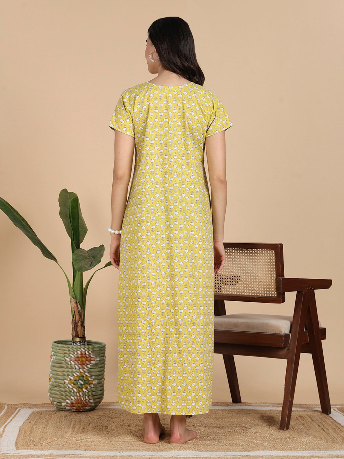 Mustard Yellow Floral Print Pure Cotton Nighty For Women