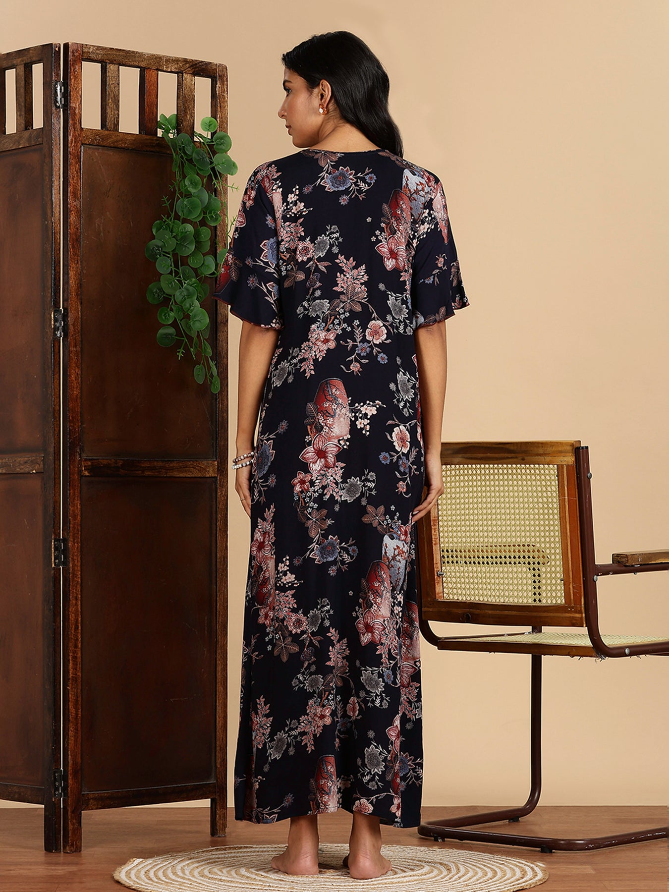 Wrap yourself in the elegance of florals. Bring home this navy floral rayon nighty and let comfort bloom with every wear.