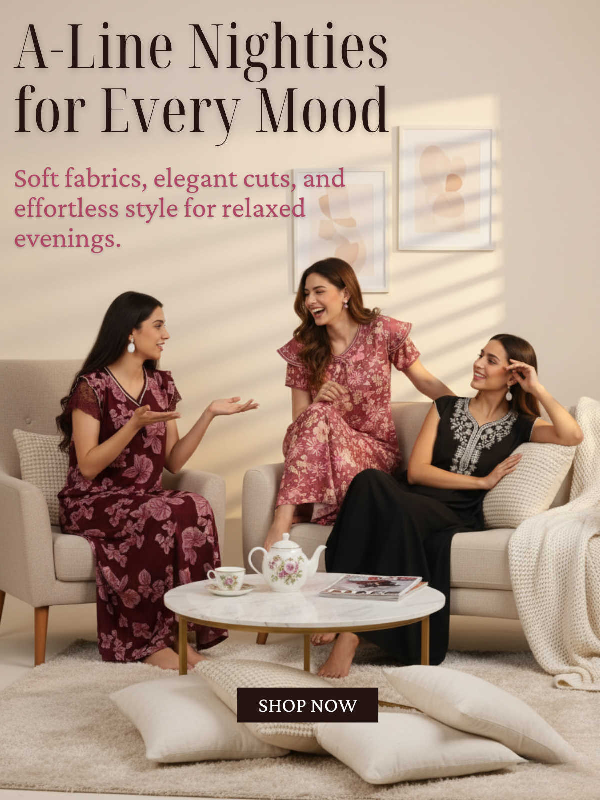 Nighties for women are more than just sleepwear, they combine comfort, elegance, and versatility for daily wear. An A-line nighty for women offers a flattering fit for all body types, whether you choose breathable cotton for hot summers, satin for a luxurious touch, or alpine for cooler nights. With thoughtful details like pockets, embroidery, and button plackets, they bring both style and practicality to your nightwear. From quiet mornings to restful nights, this silhouette works for every season and mood. If you’re looking for more fabrics like rayon, pure cotton, denim, and many others, explore our full range of nighties for women to find your perfect match.