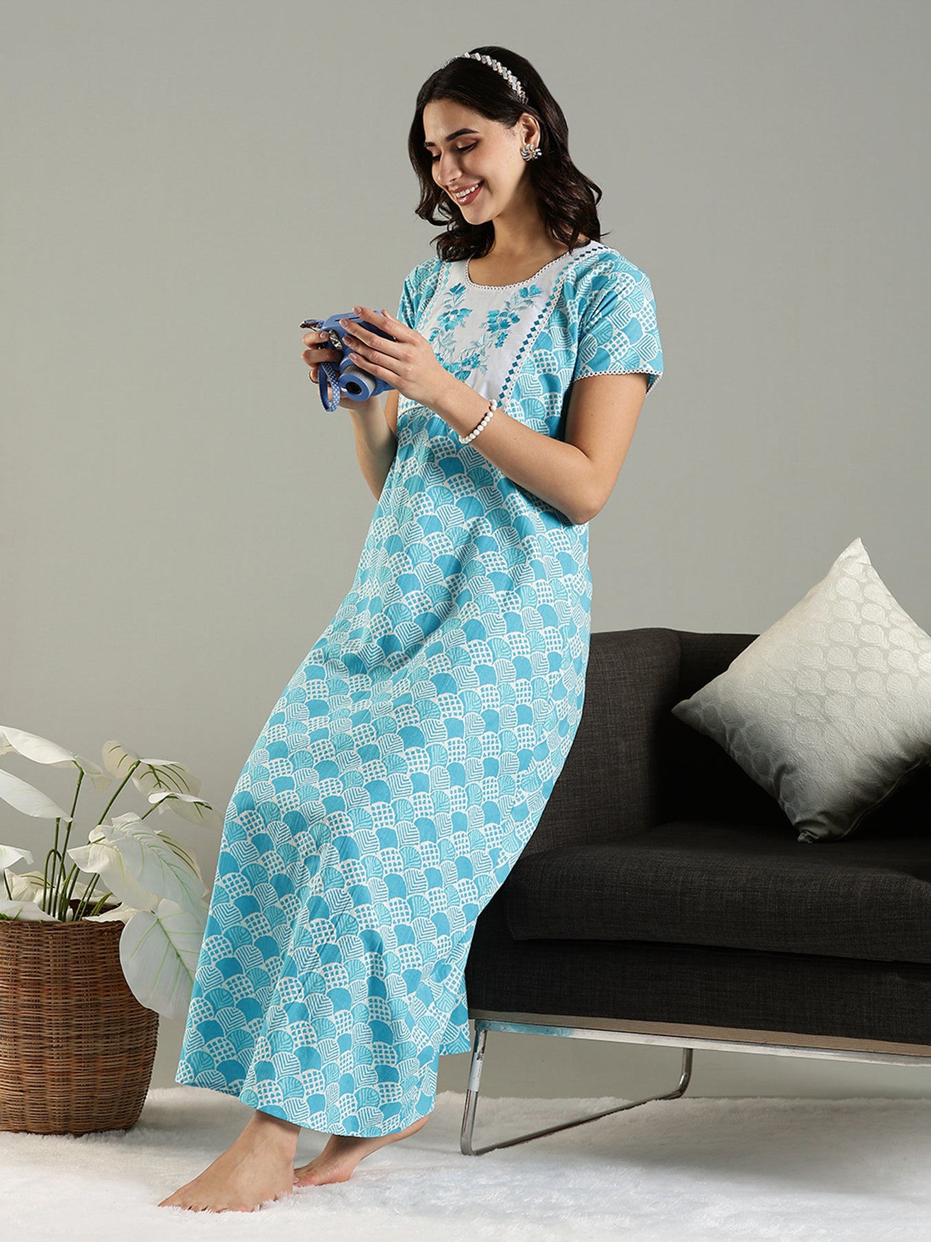 Blue Pure Cotton Embroidered Nighty – Effortless Elegance for Everyday Comfort