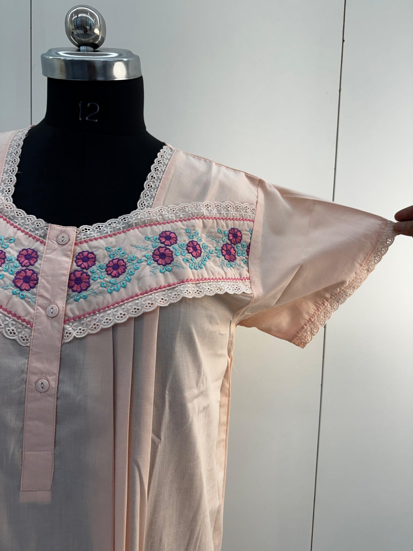 Peach Glow Poly Cotton Nighty with Colorful Floral Embroidery