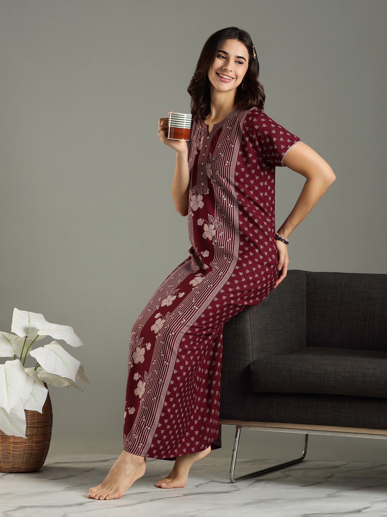 Wine Alpine Designer Nighty for Women with Floral Stripe Print