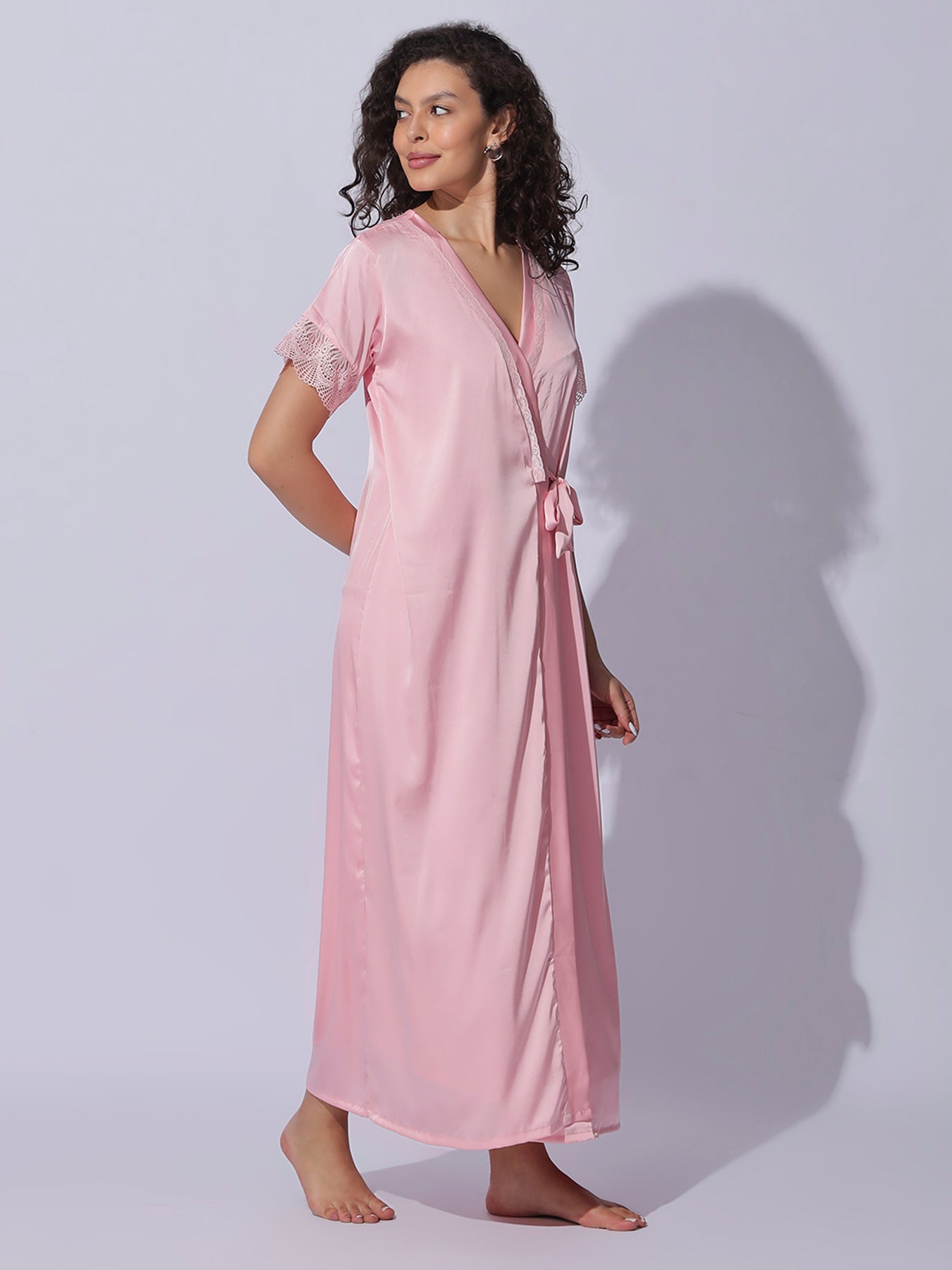 Matching Satin Robe: Comes with a solid satin robe featuring short lace-trim sleeves