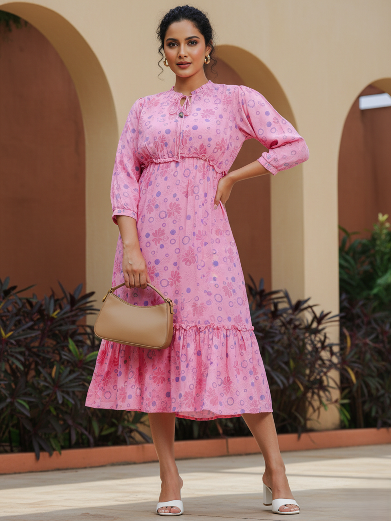 Premium Fancy Neck Baby Pink Polyester Floral Printed Plus Size Dress