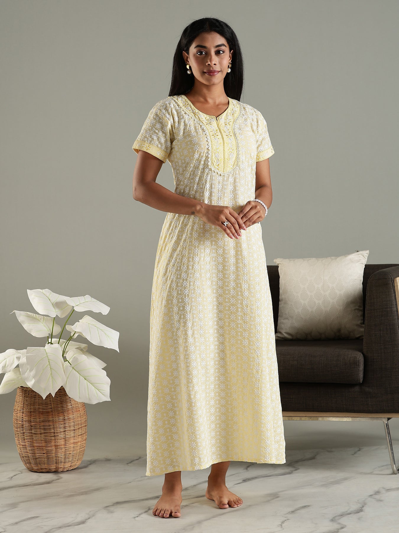 Soft Yellow Pure Cotton Chikankari Nighty for Women Comfortable and Elegant