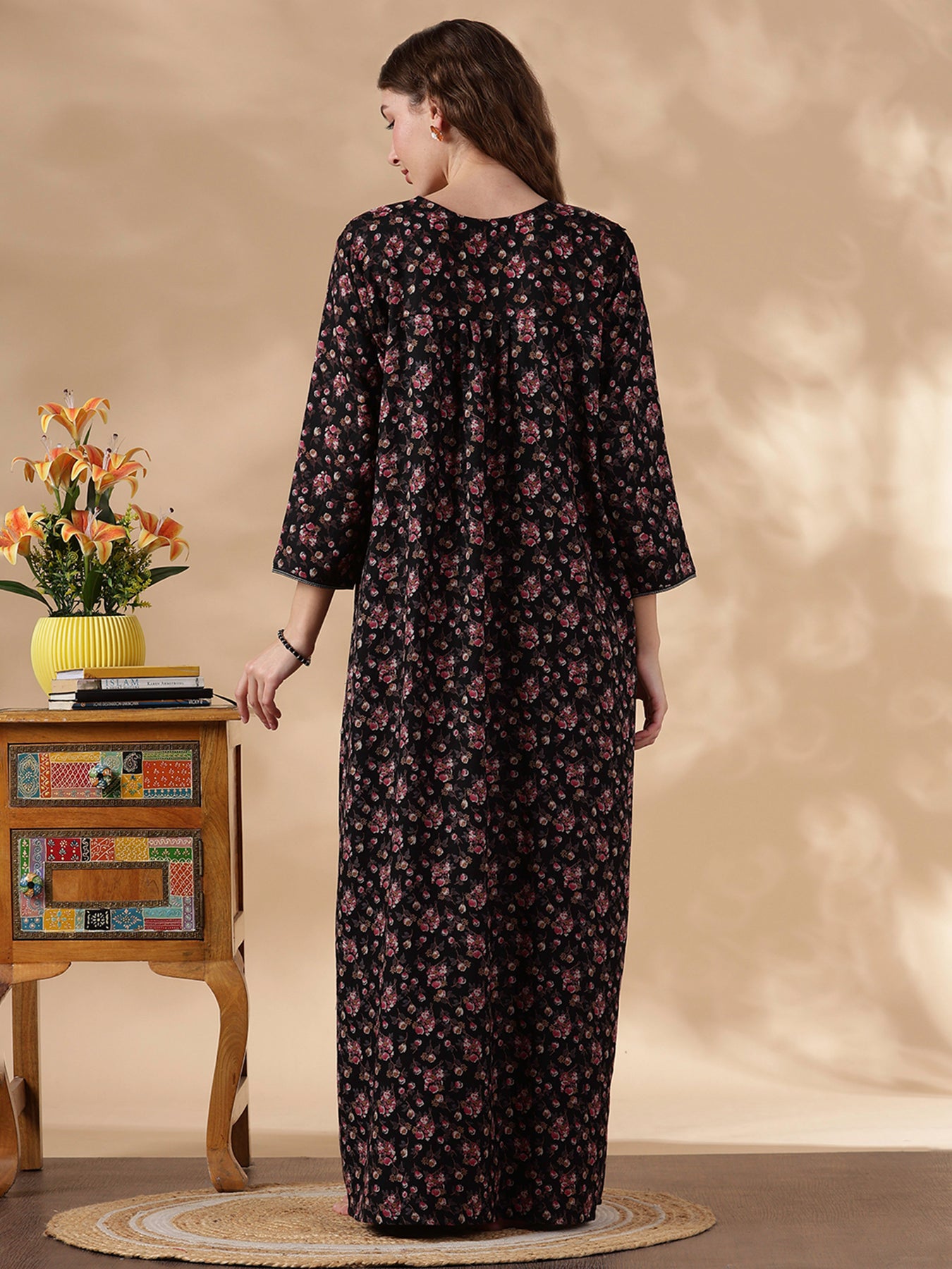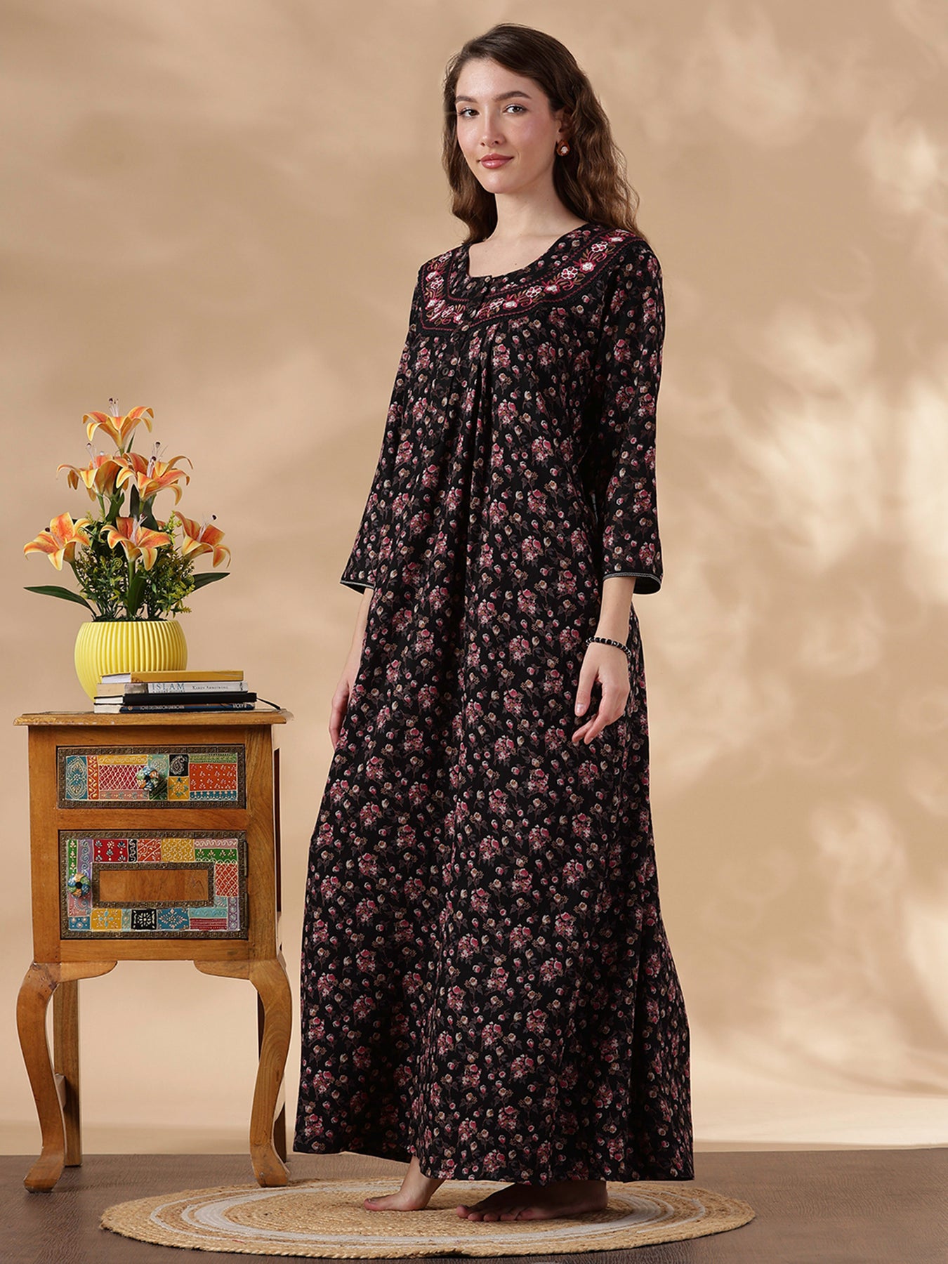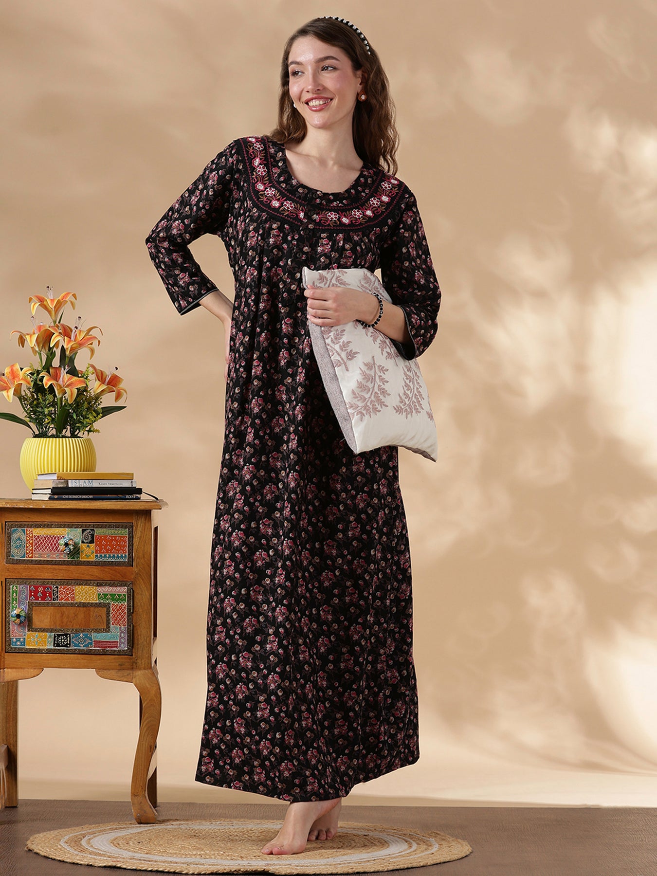 The magenta floral palette stands out beautifully, combined with embroidery and soft fabric, perfect for women who enjoy elegant yet easy nightwear. Designed with full sleeves and a relaxed fit, it provides cozy coverage without feeling restrictive. The embroidered lace neckline adds a touch of artistry, making your sleep routine feel a little more special every night.