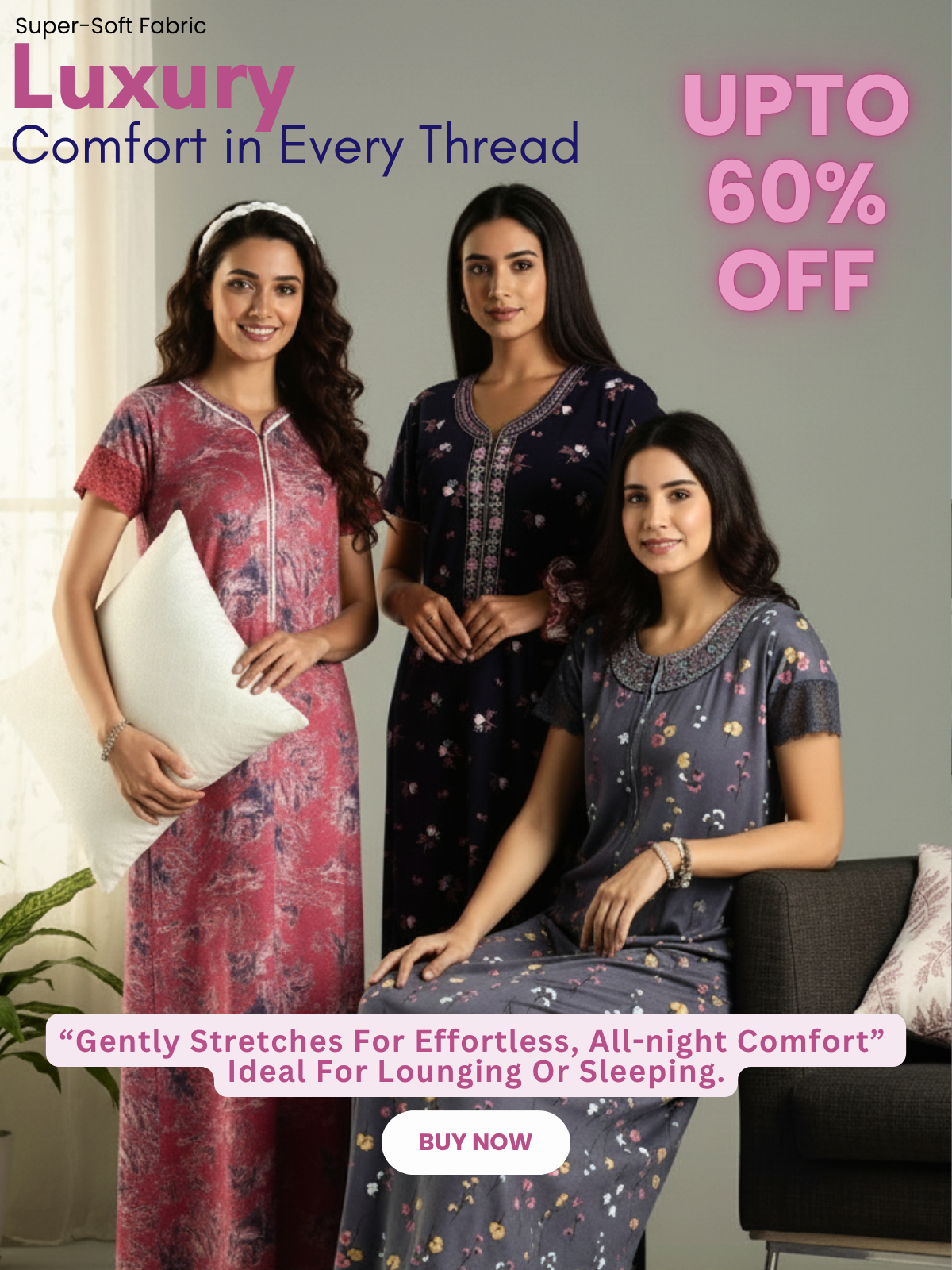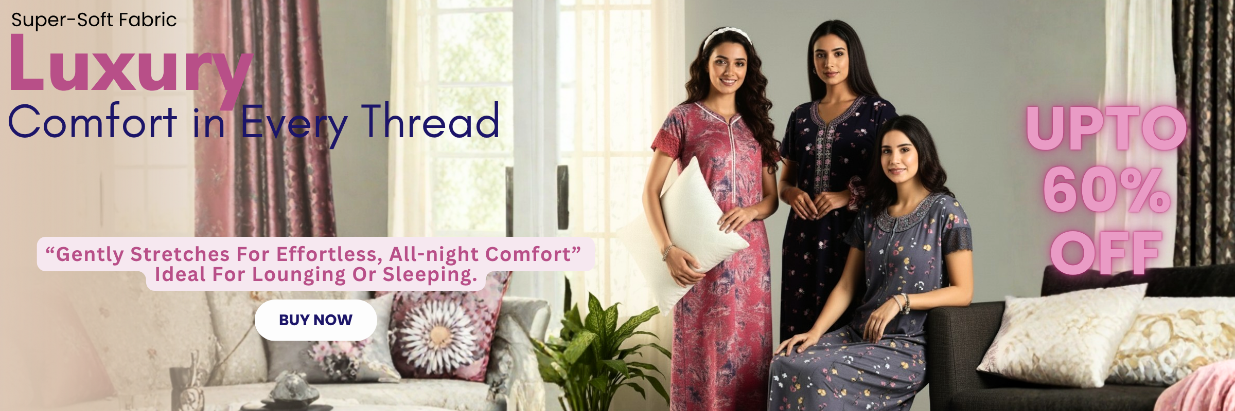 If you’re looking for more variety, we offer many other types of nighties for women in different fabrics like satin, denim, cotton crush, viscose, and more each crafted for comfort and style. Explore our main collection of nighty for women to find the perfect nightwear that matches your mood and every season.