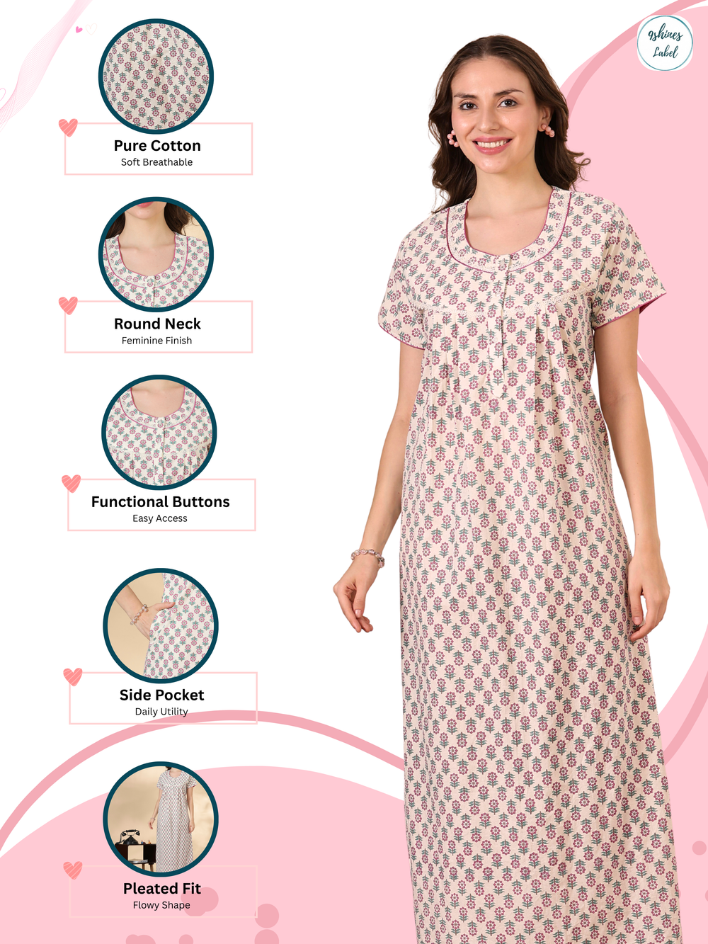 A pure cotton nighty for women is made from 100% natural cotton, a fabric that allows air to pass through easily (breathable) and feels soft against the skin. It absorbs sweat quickly, keeping you cool and fresh even on hot, humid nights. With different prints, embroidery patterns, and relaxed fits, pure cotton nighties are a favorite choice for women who love soft, natural fabrics for everyday sleepwear.