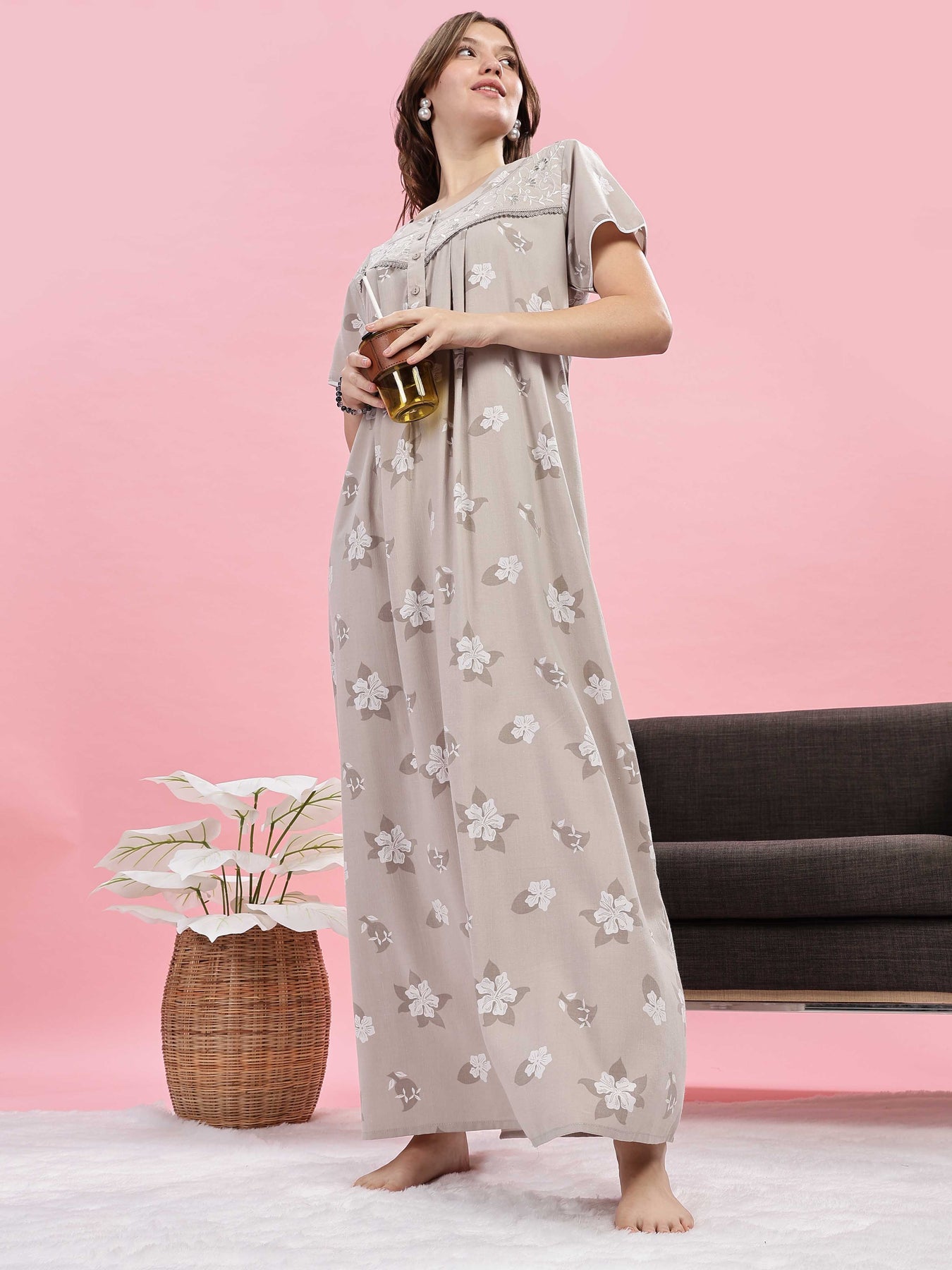 Beige Floral Maxi Nighty with Embroidered Yoke and Side Pocket