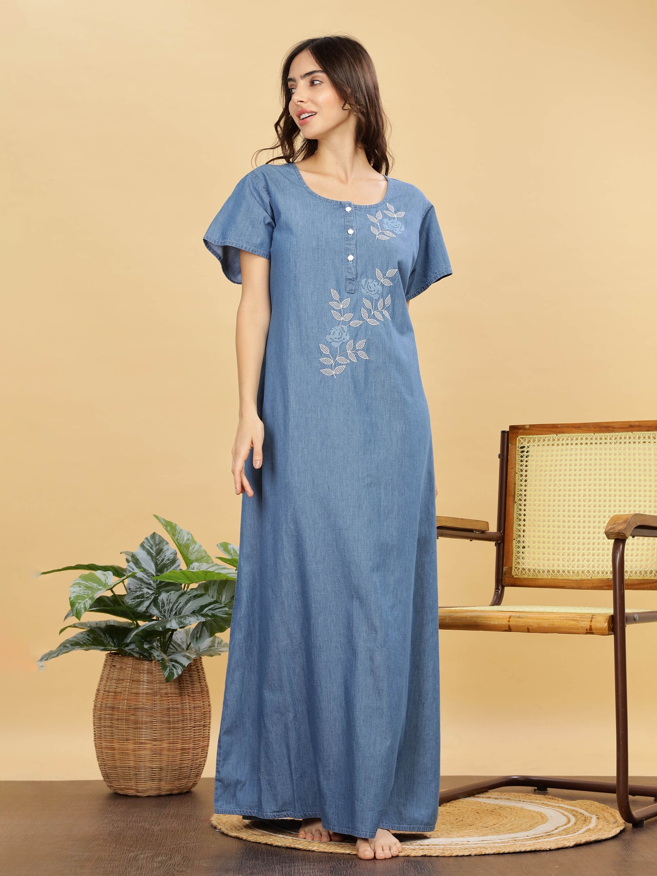 Shop the 9shines Label Soft Cotton Denim Embroidered Nighty for women and enjoy comfort with every wear, designed for real moments at home.