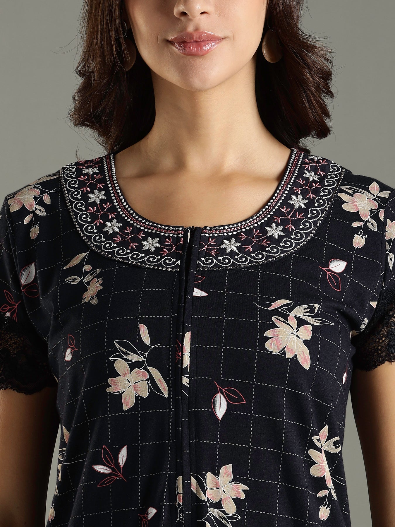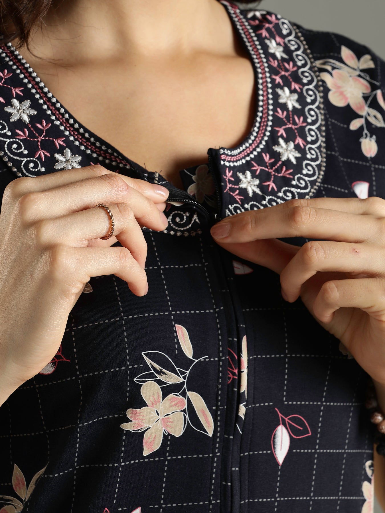 Hosiery Cotton Grid Floral Zip Nighty Floral Navy Blue