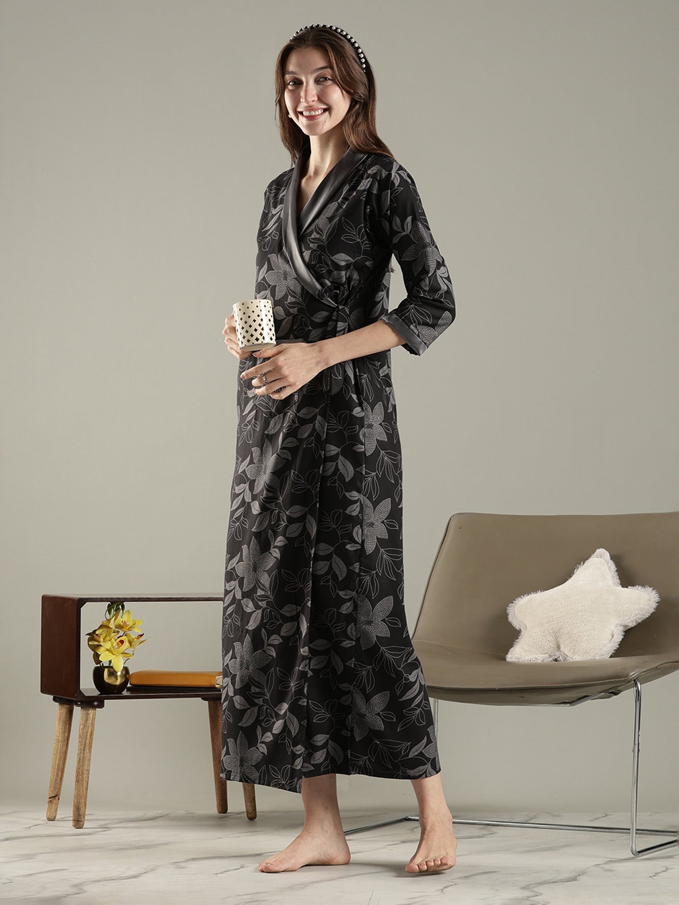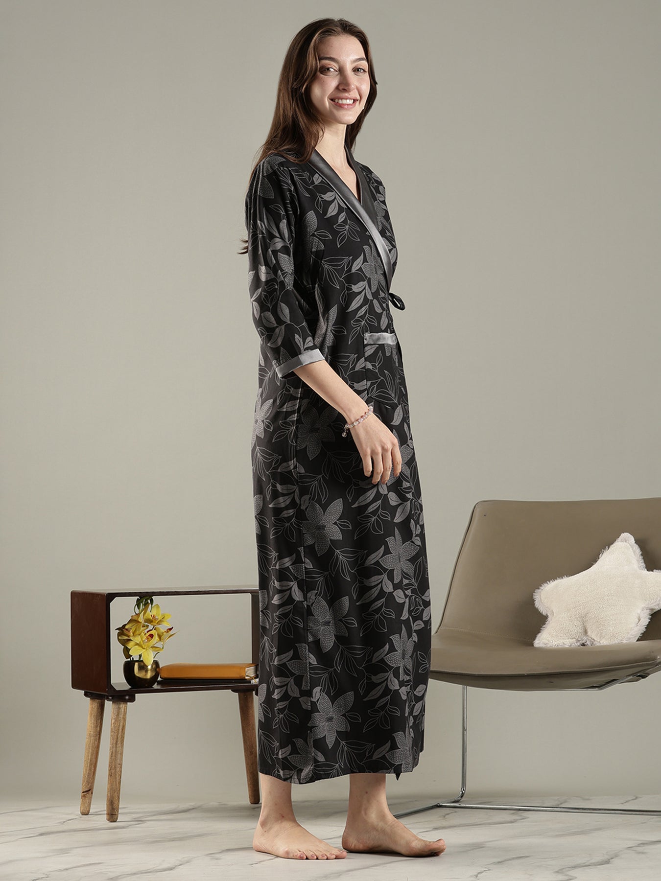 Designed for effortless comfort and a clean, polished look, this wrap-style house coat is ideal for everyday home wear. Crafted from a breathable viscose blend, it feels light on the skin and drapes naturally for a relaxed silhouette. The thoughtful double-knot design with one inner tie and one outer tie ensures the robe stays securely in place without shifting, allowing easy, confident movement throughout the day. Finished with a calming floral leaf print and a contrast shawl collar, it blends comfort with subtle elegance—perfect for relaxed mornings, daily routines, and quiet evenings at home.