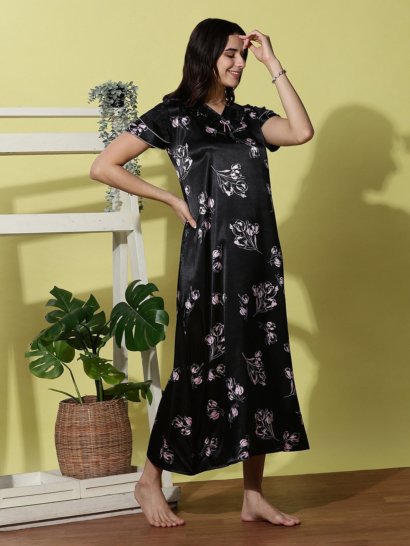 Black Tulip Satin Designer Nighty for Women Elegant and Soft