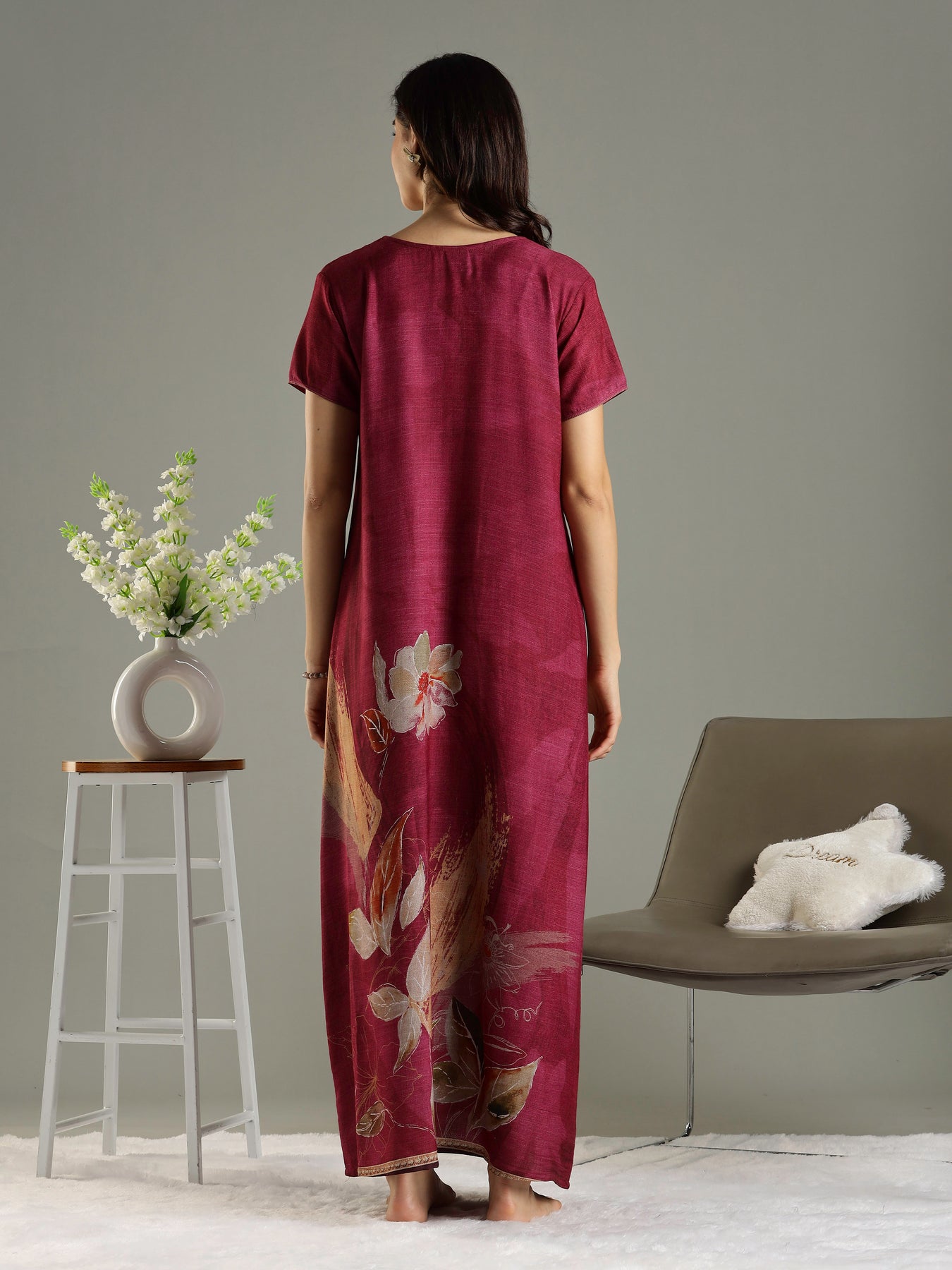 Magenta Pink Alpine Designer Nighty with Floral Digital Print and Embroidery