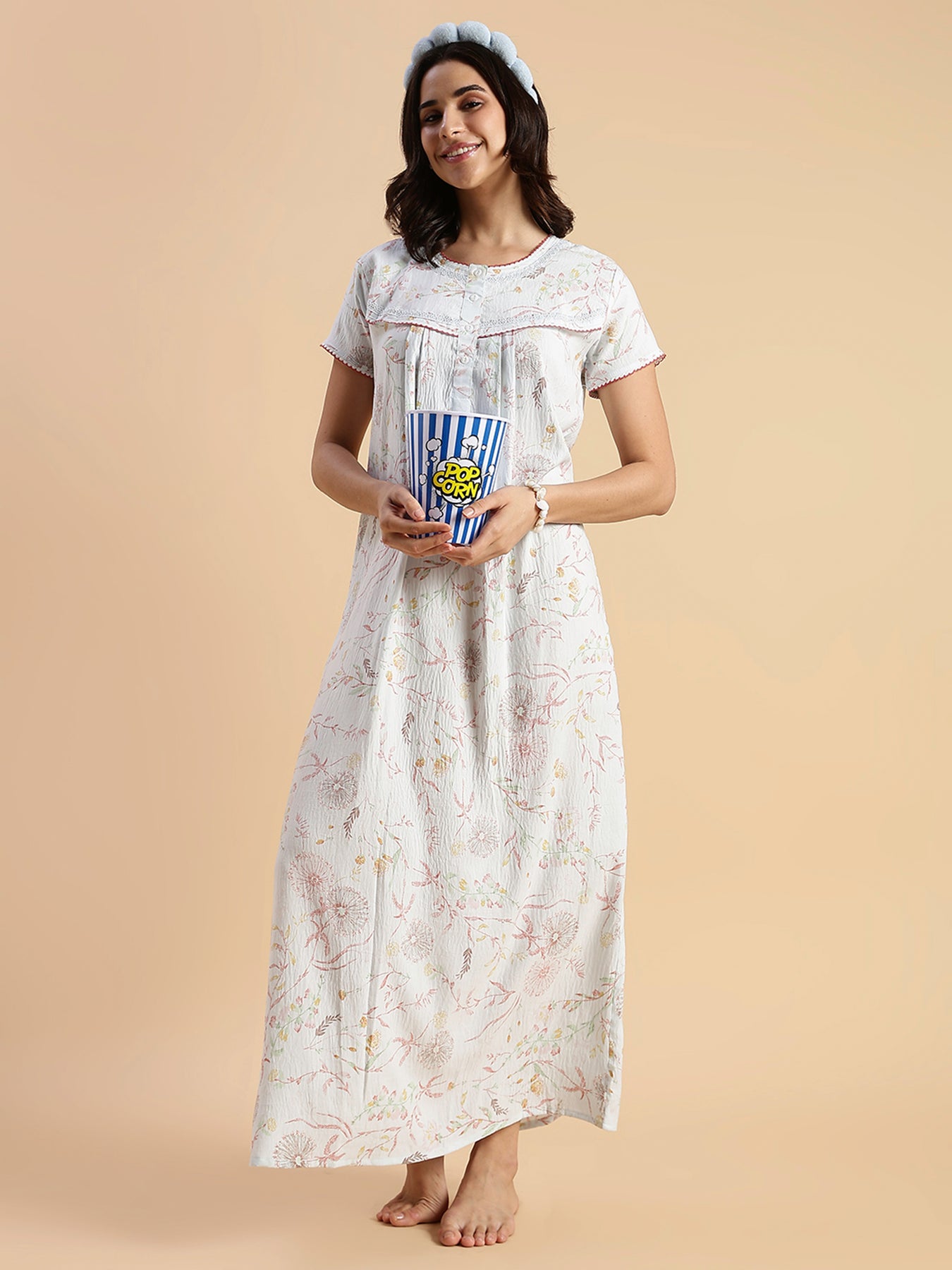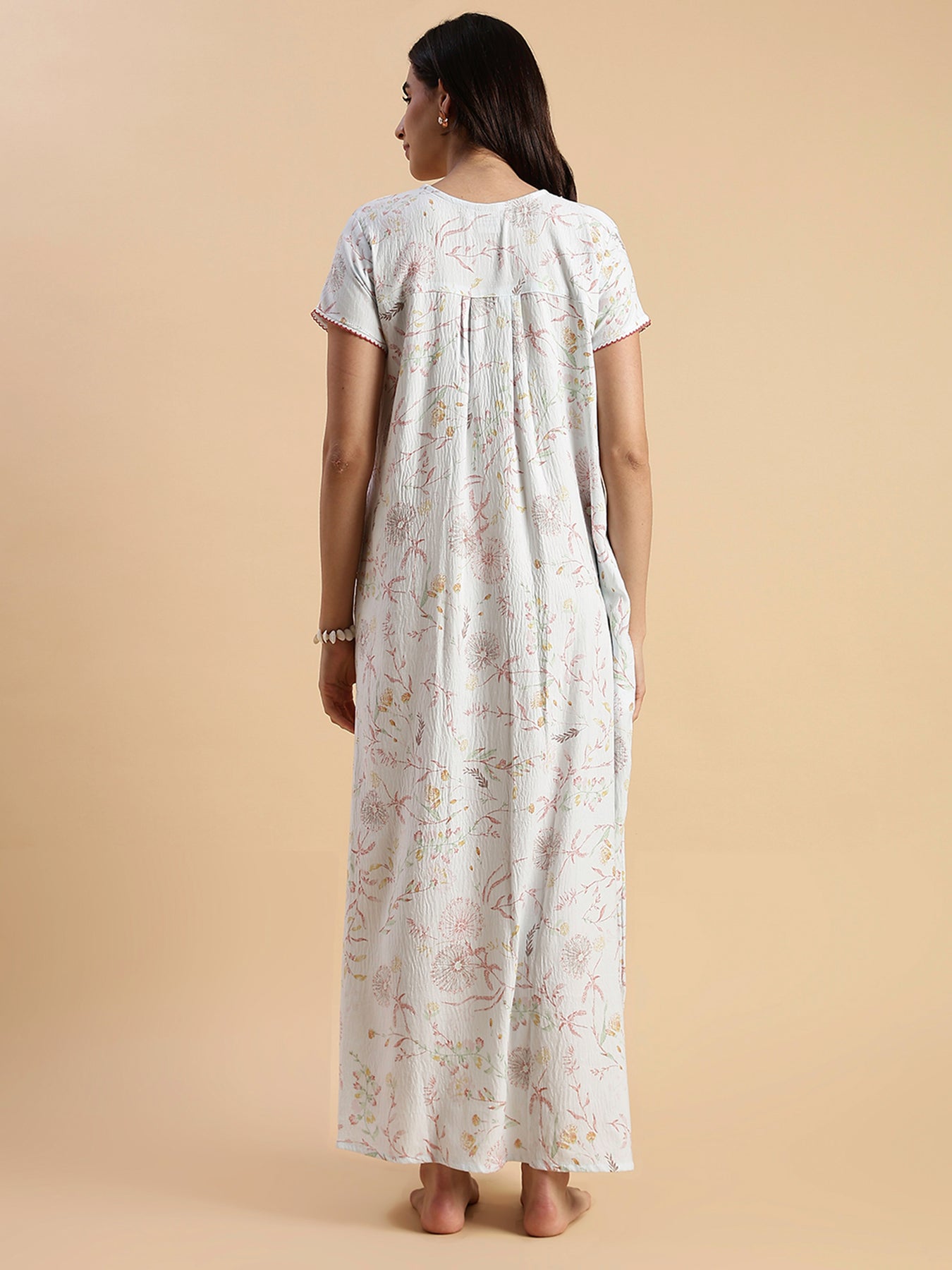 Experience effortless comfort with this Premium Crush Designer Nighty in Pastel Blue. Made from soft pure cotton with a breathable crush texture and a smooth bamboo-cotton feel, it helps you stay cool, fresh, and relaxed all night long. The pastel floral print, lace-trimmed yoke, and contrast scallop edging add a gentle, feminine charm, while the pleated front and back enhance its breezy, flowy silhouette. Ideal for warm nights, everyday lounging, or peaceful sleep, this nighty blends calming blue tones with natural comfort.
