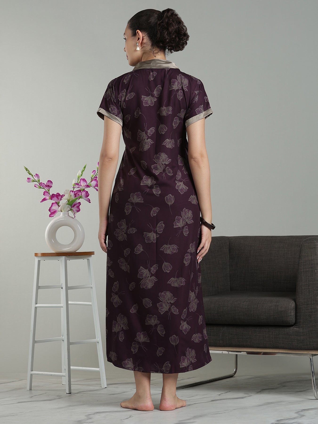 Prussian Fig Viscose Blend Housecoat with Floral Sketch Print for Women