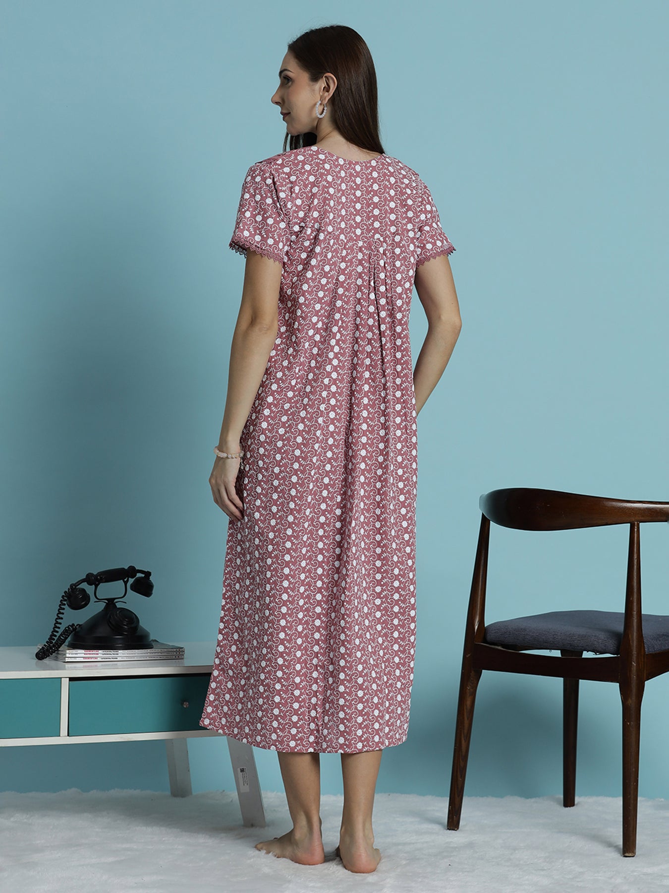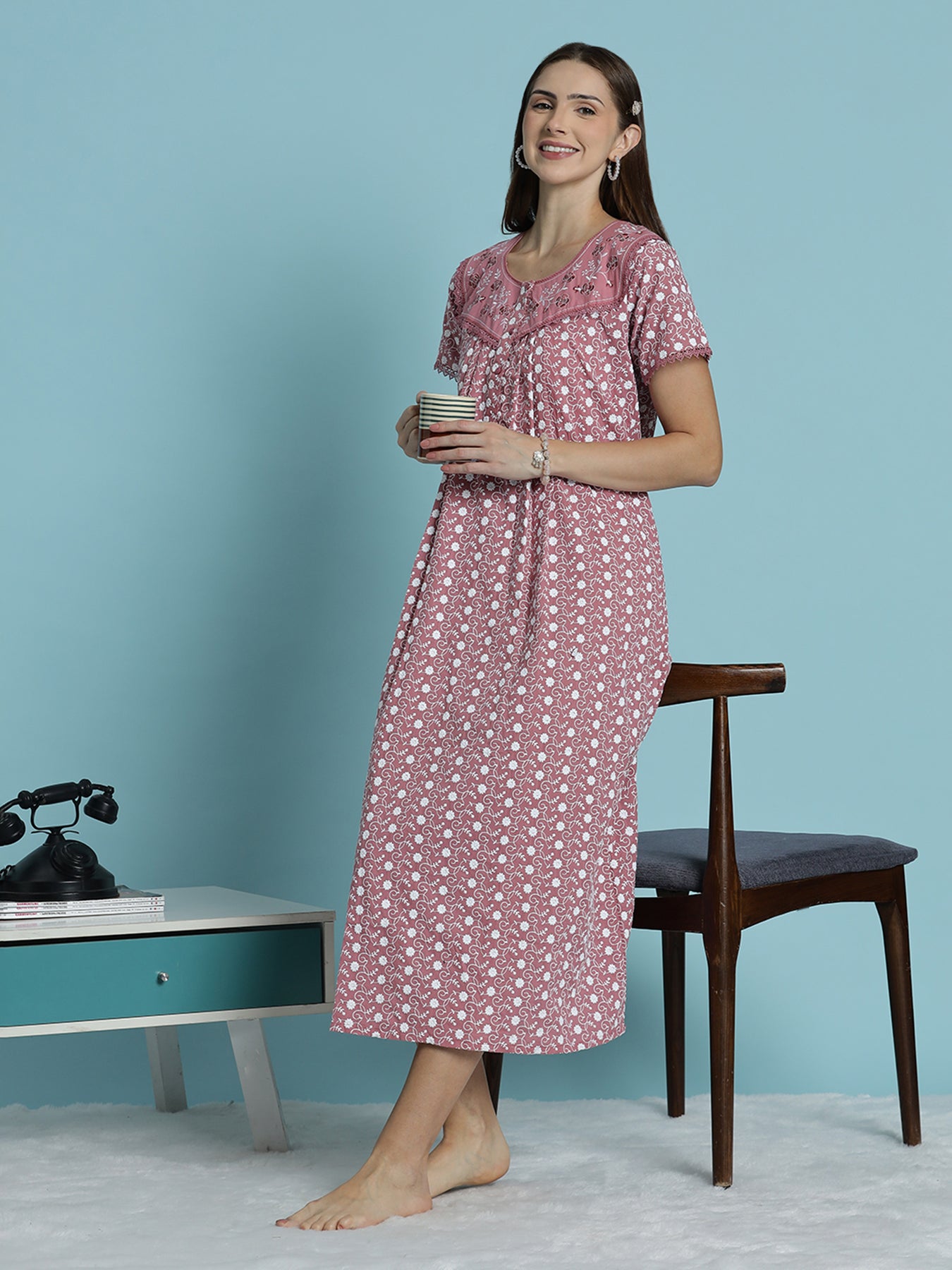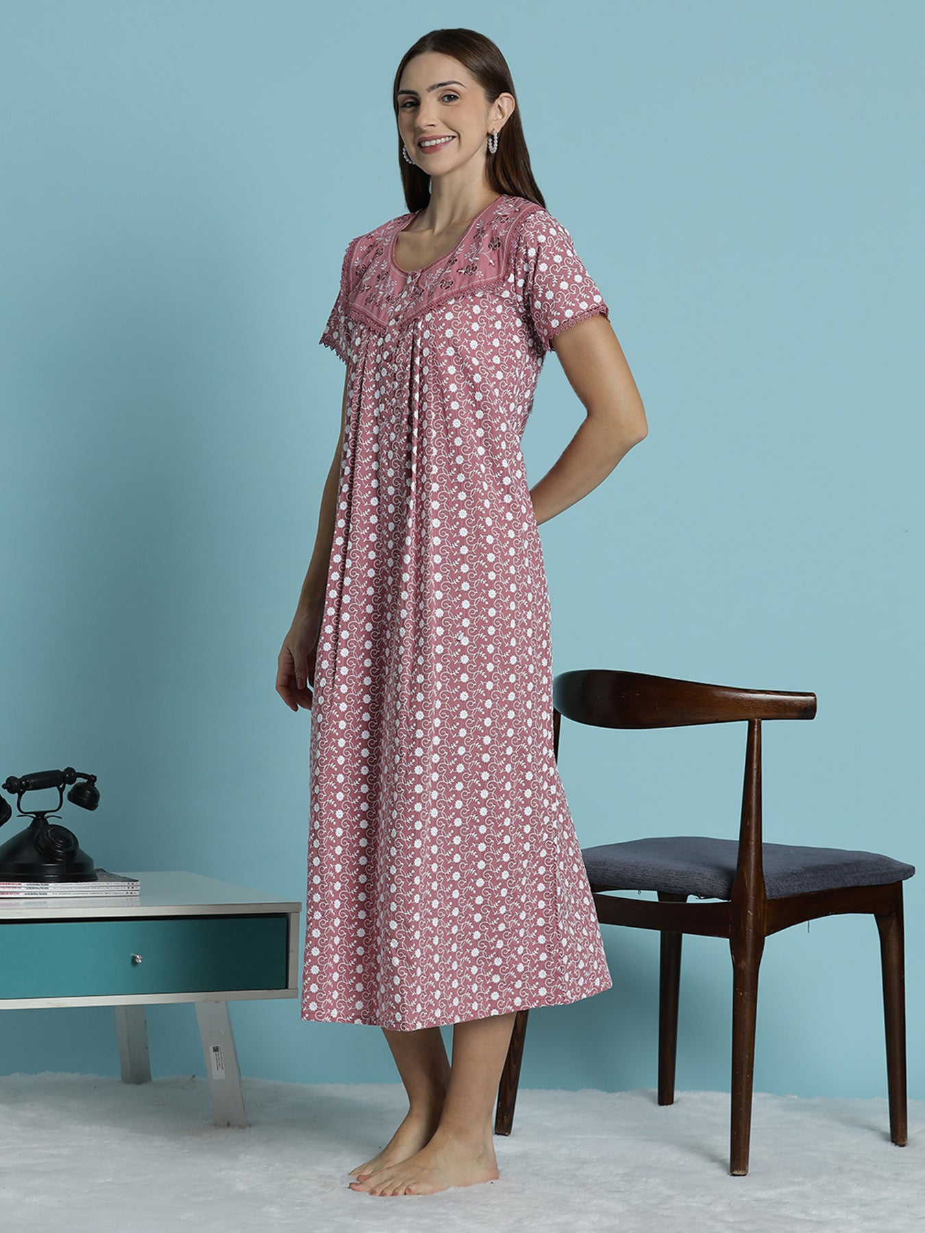 Designed for everyday elegance, this cotton nighty offers lasting comfort, flattering fit, and durable embroidery—making it a reliable choice for daily nightwear.