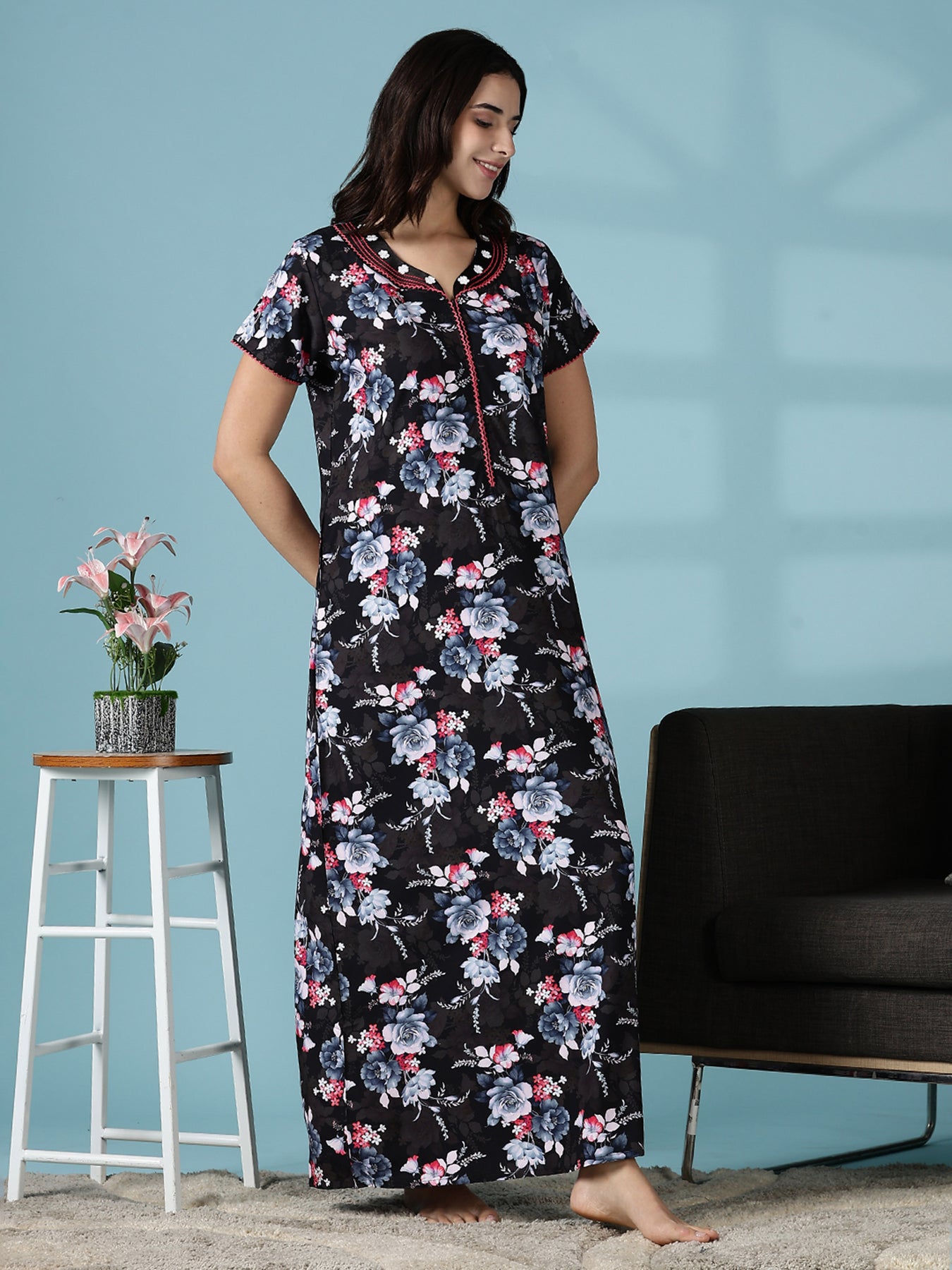Bring home this Multi Black Rayon Floral Nighty and refresh your nightwear wardrobe with comfort that feels luxurious yet lightweight.
