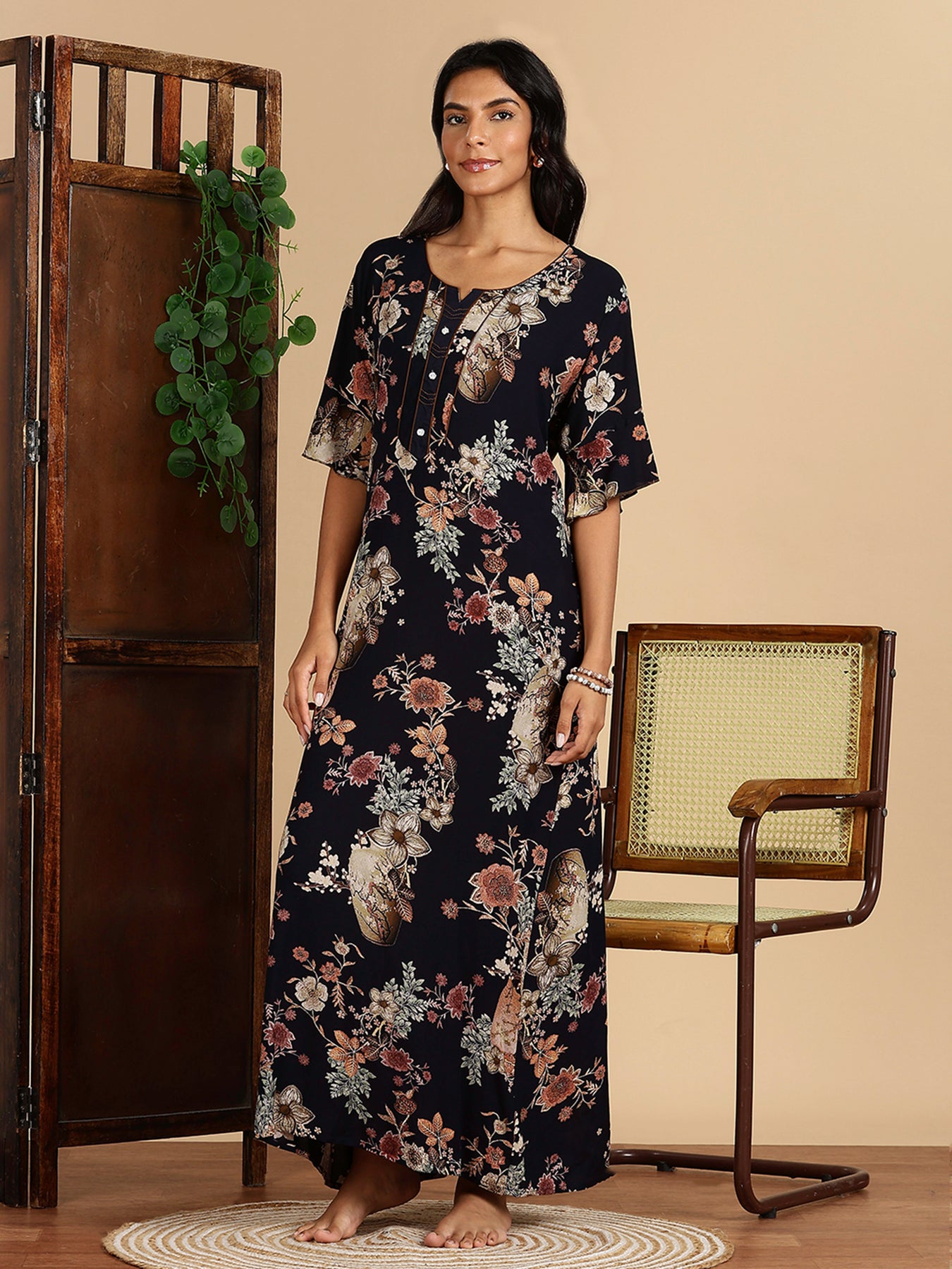 Rayon Garden Floral Designer Night Dress with Button Yoke and Pocket