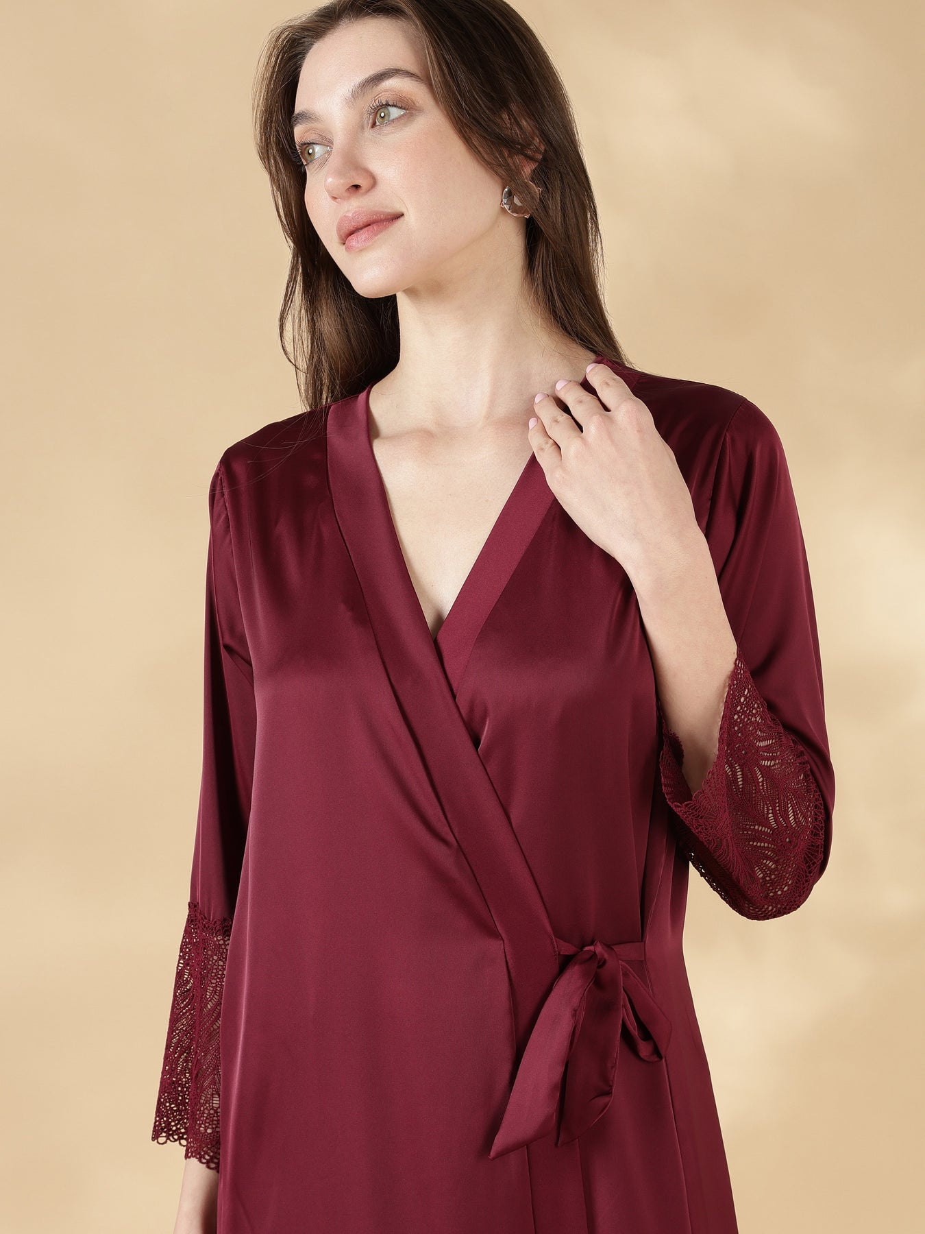 This satin nightdress stands out for its fluid drape, feminine lace accents, and versatile two-piece design. The flowing robe adds elegance, while the inner slip ensures comfort, creating a perfect balance of style and ease. Bring home this Satin Designer Nighty in Wine Rose and enjoy a night dress for women that feels as beautiful as it looks.