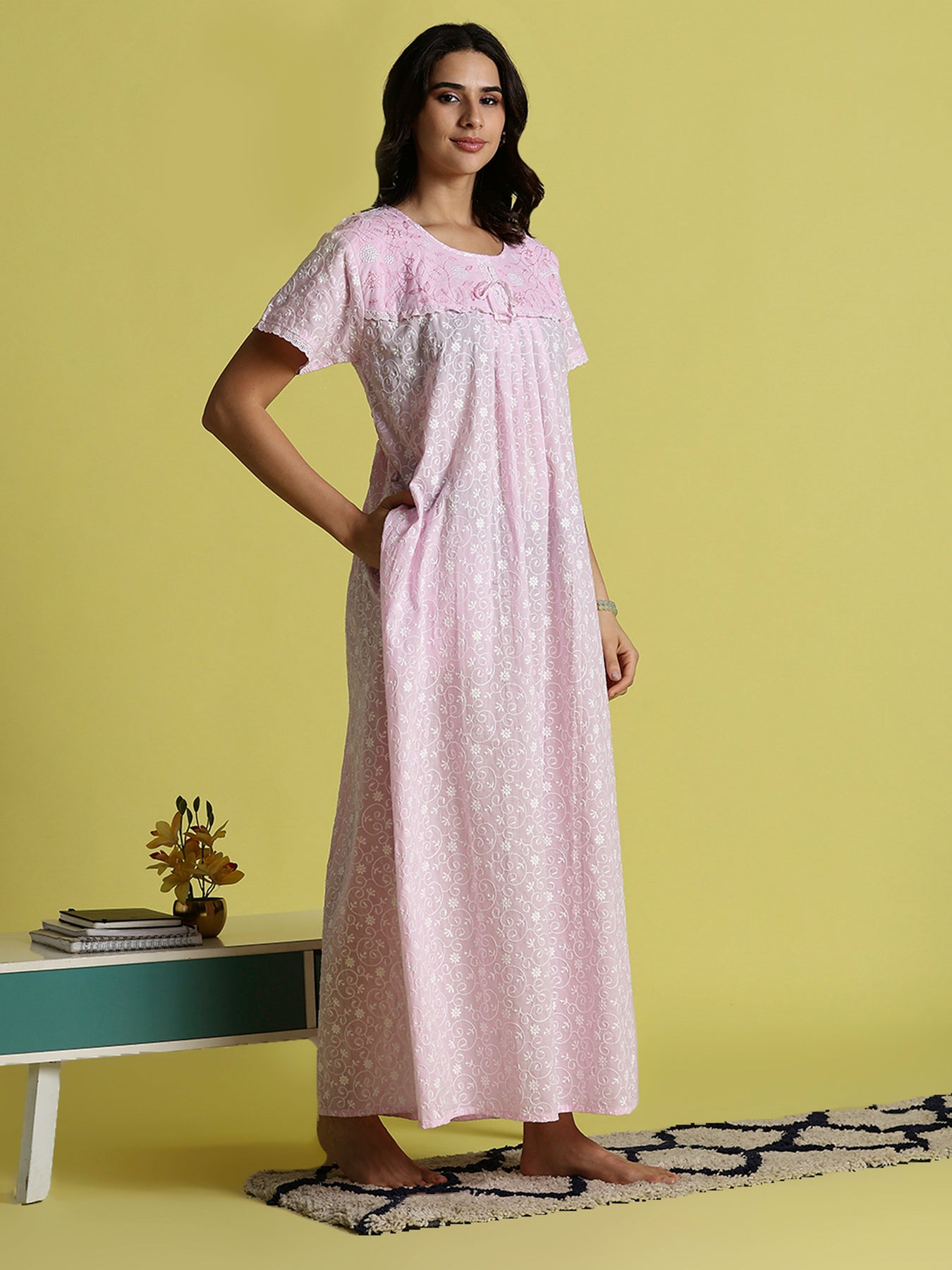 Powder Rose Cotton Chikankari Nighty For Women with Pleats and Side Pocket