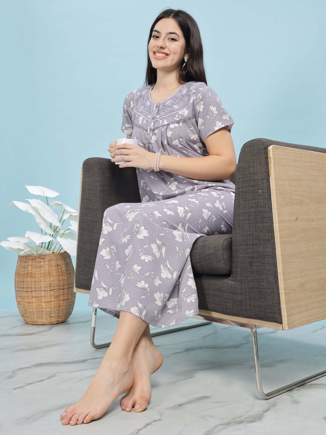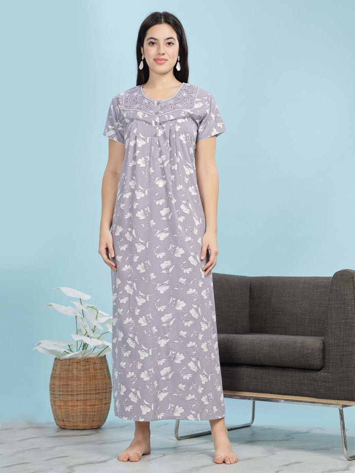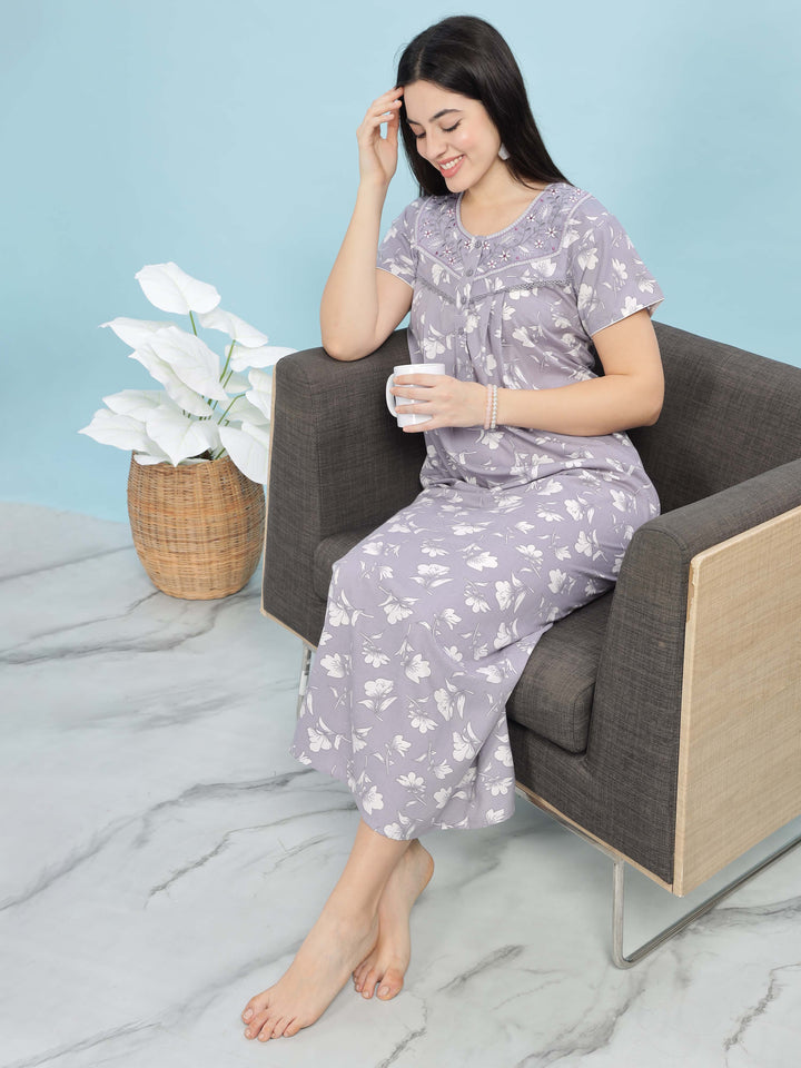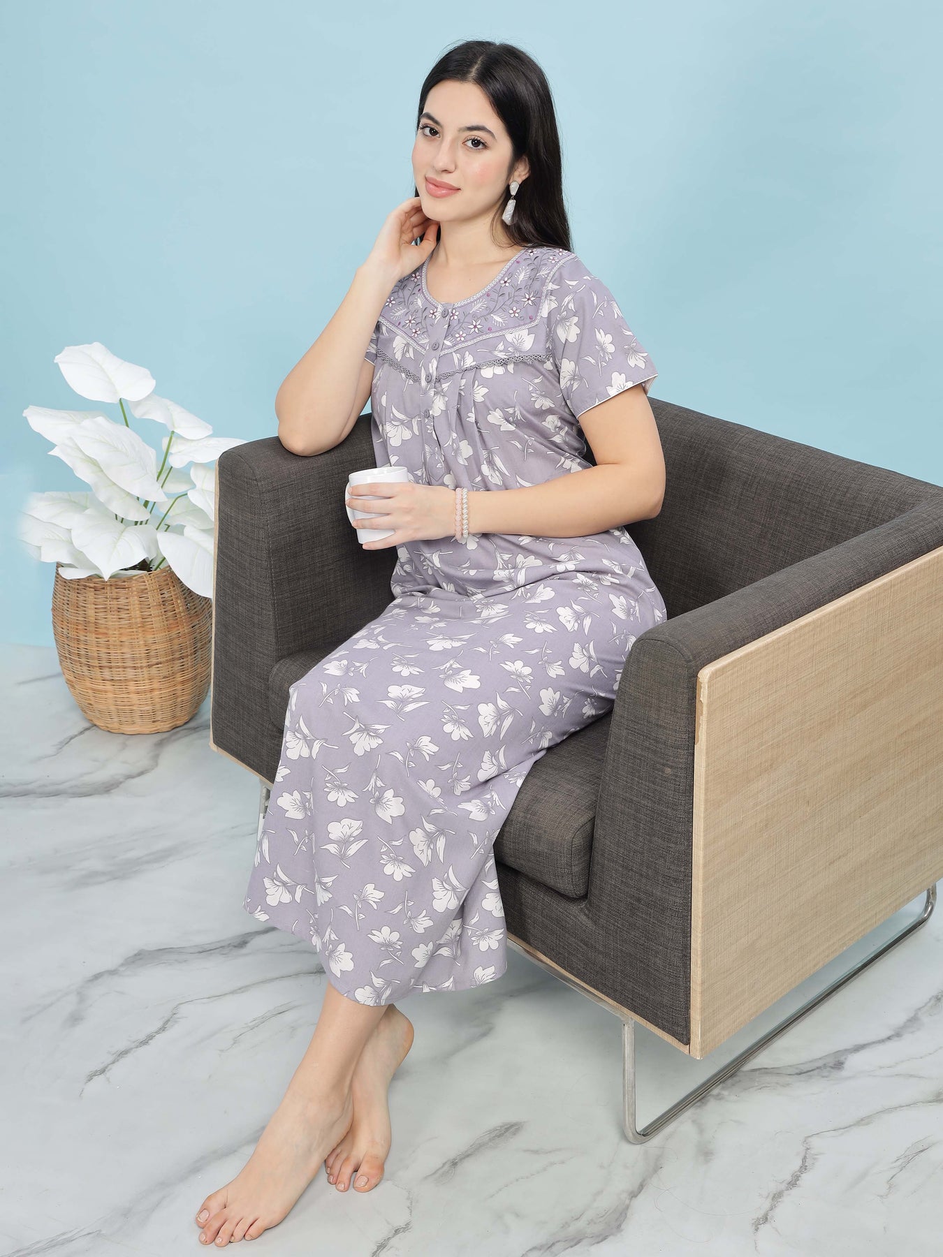 Experience luxury with the Light Lavender Pleated Nighty from 9shines Label. Featuring a delicate floral print, embroidered neckline, and a handy side pocket. Ideal for maternity and plus-size sleepwear. Stylish and breathable for comfortable nights. Perfect for lounge or home wear.