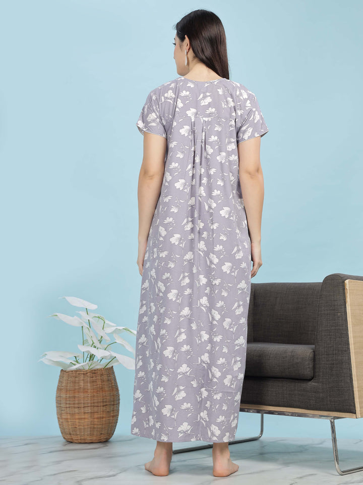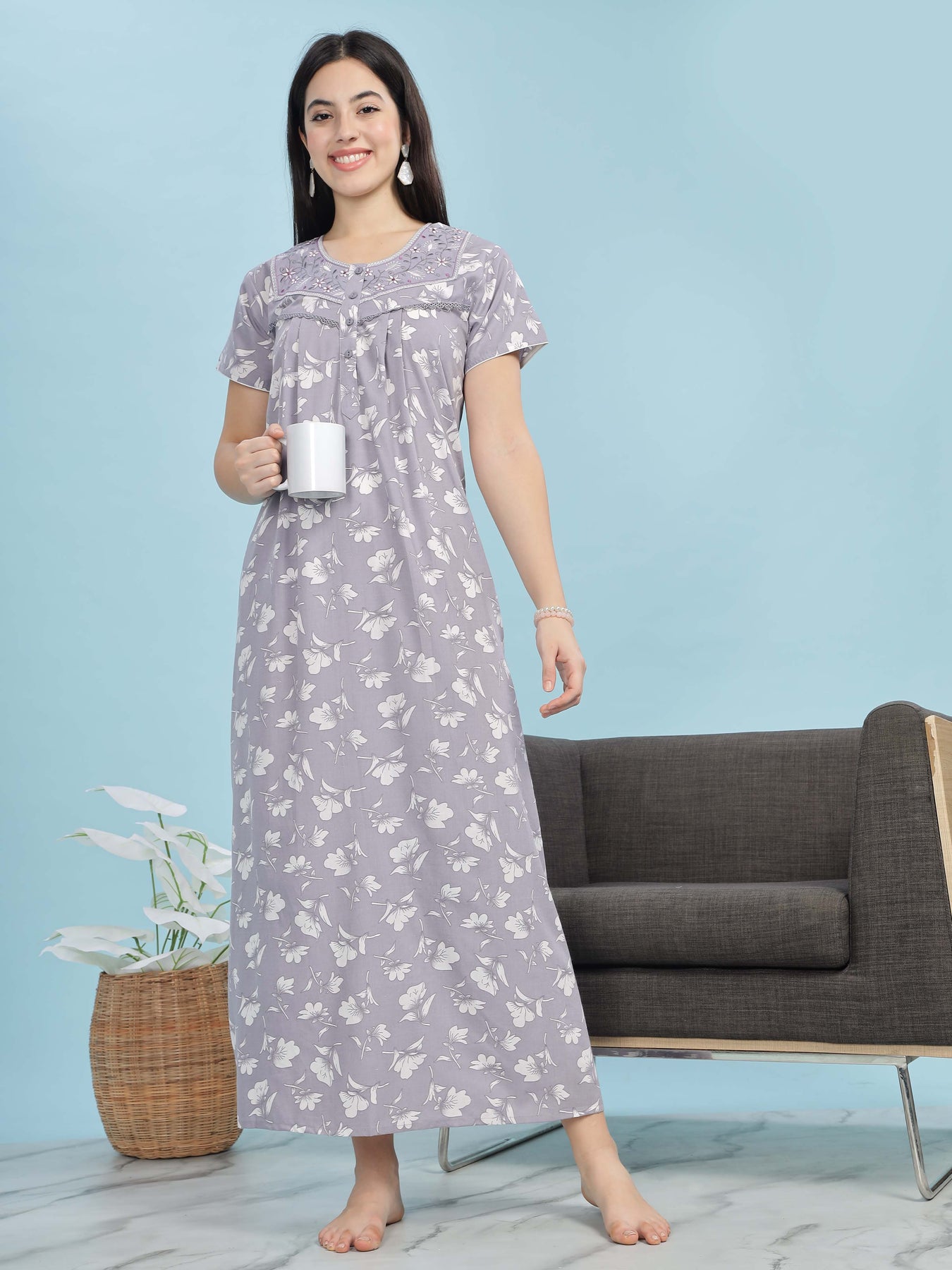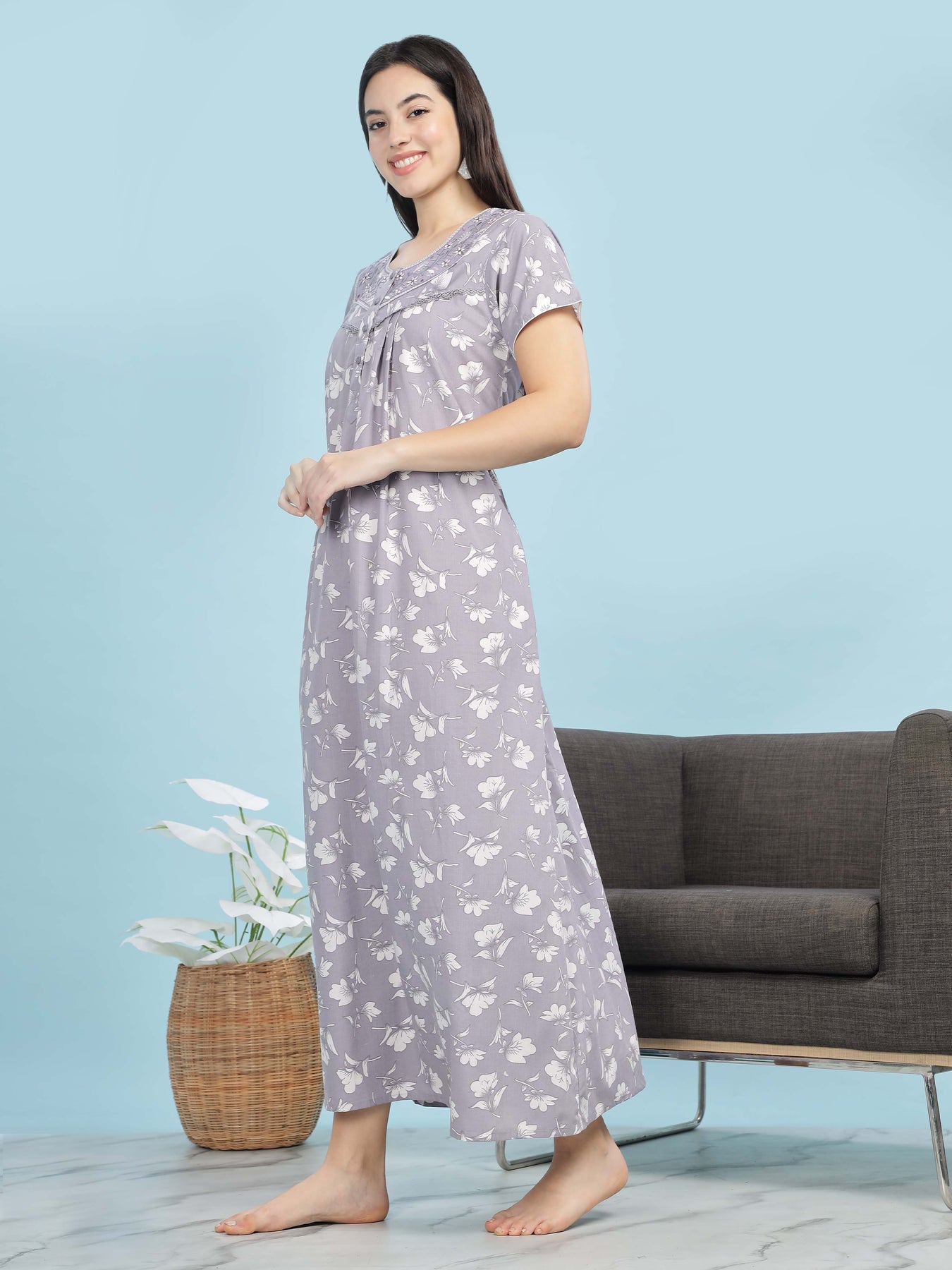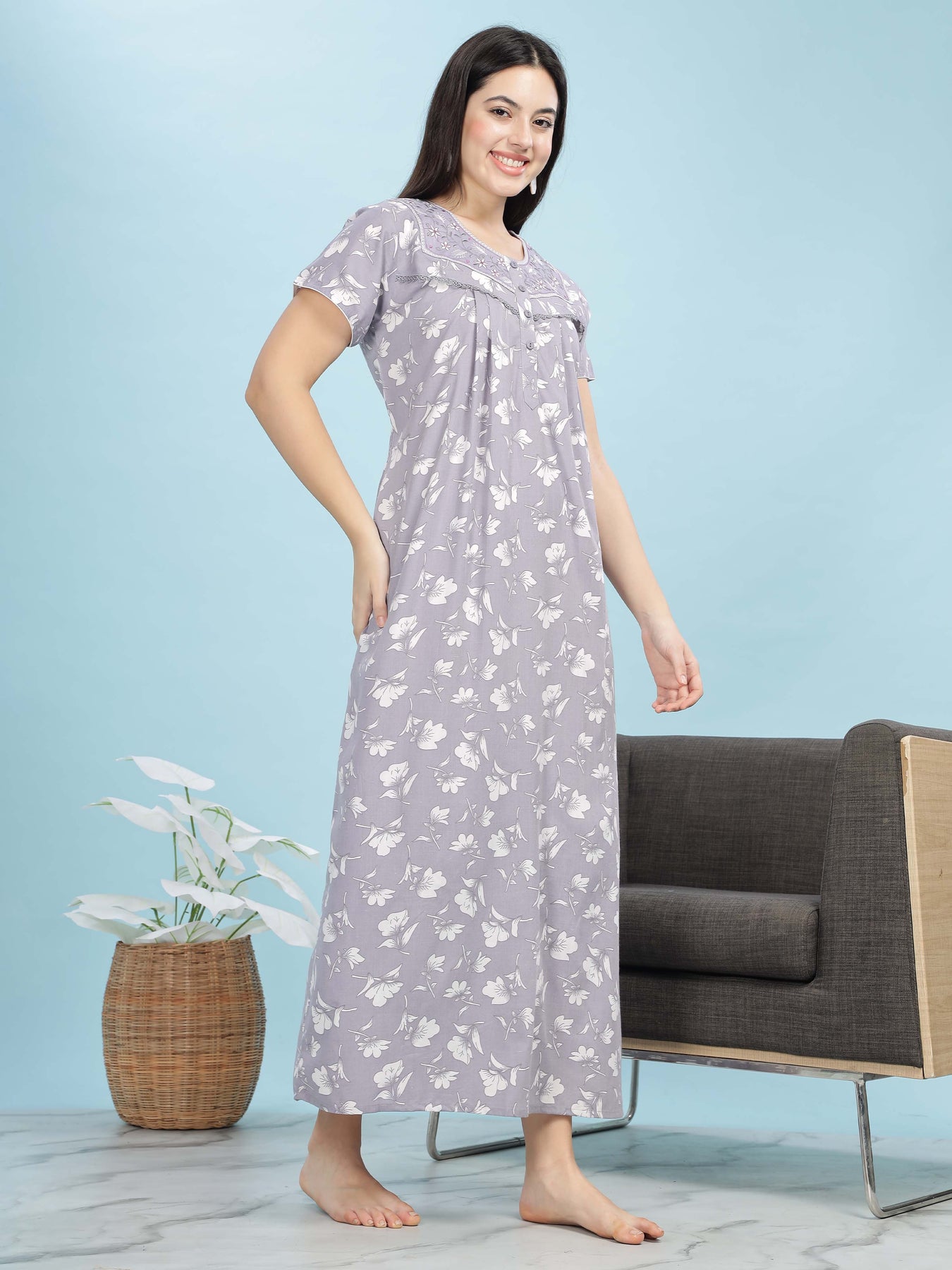 Experience luxury with the Light Lavender Pleated Nighty from 9shines Label. Featuring a delicate floral print, embroidered neckline, and a handy side pocket. Ideal for maternity and plus-size sleepwear. Stylish and breathable for comfortable nights. Perfect for lounge or home wear.