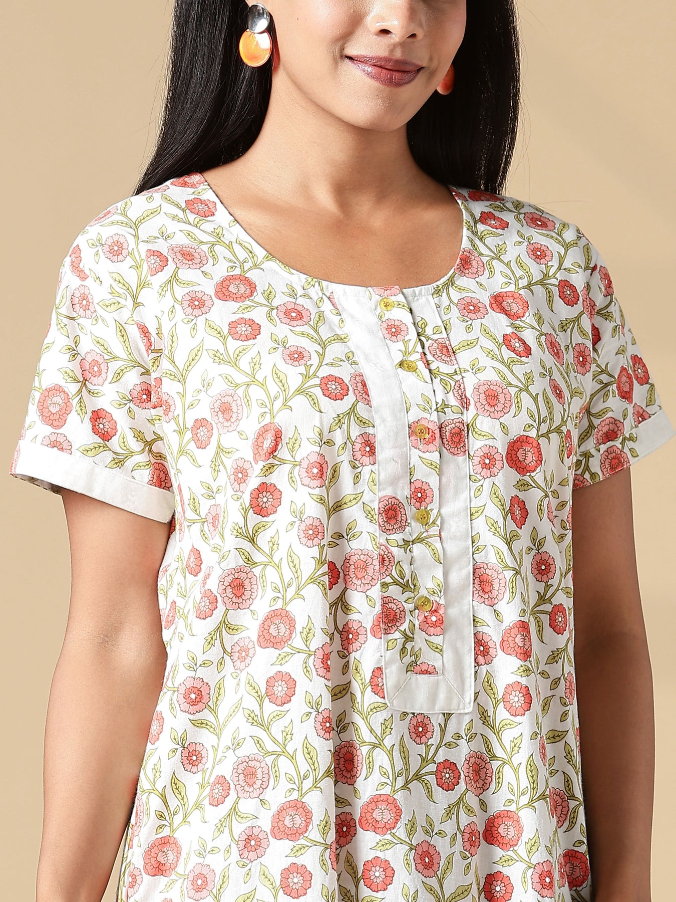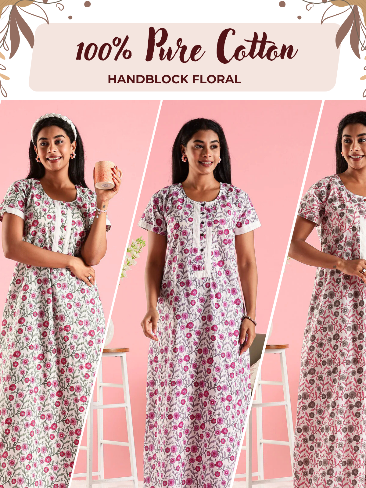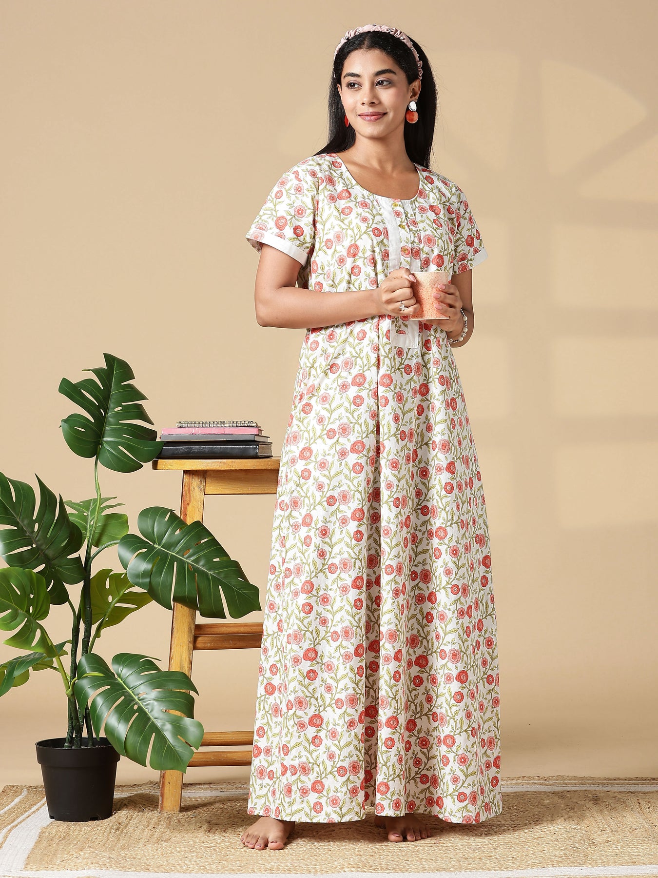 Wrap yourself in comfort that feels like home. Made from 100% breathable cotton, this floral print nightdress features a relaxed A-line silhouette and a delicately stitched front yoke that adds both shape and charm. The round neckline is complemented by a front placket with usable buttons making it not just elegant, but also functional for nursing mothers. Whether you’re relaxing after a long day, managing your new mom routine, or simply enjoying a slow weekend, this maxi nightdress brings softness, style, and thoughtful utility together. Its block-style floral print, structured yoke, and practical pocket make it the perfect blend of everyday luxury and convenience.