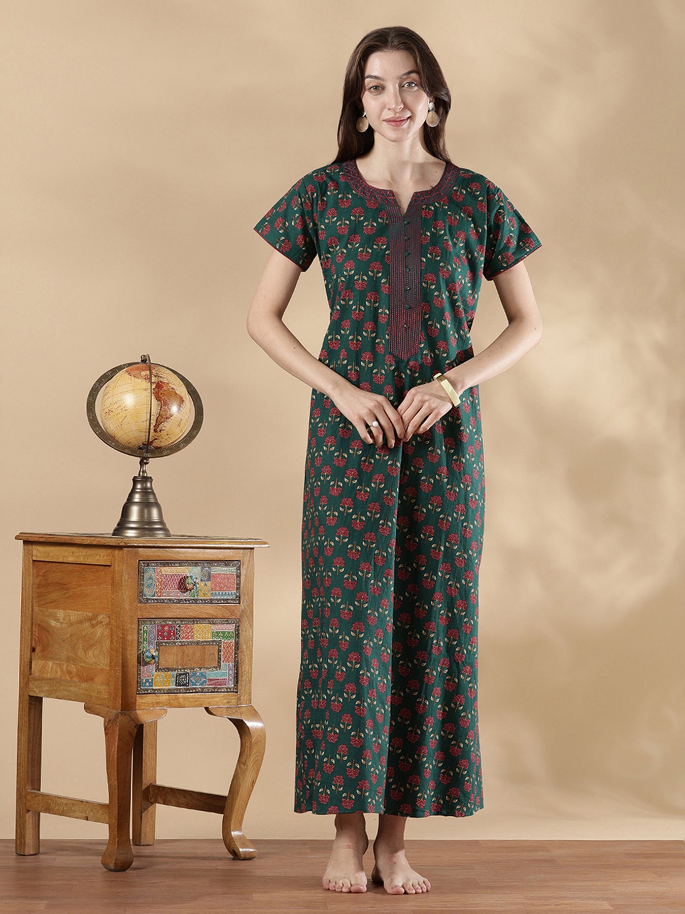 Experience calm nights and relaxed mornings with this pure cotton designer nighty. Designed in an easy A-line silhouette, it flows gently over the body, making it ideal for sleep, lounging, and daily wear. The all-over traditional floral print paired with a contrast embroidered yoke adds a subtle ethnic charm while keeping the look timeless.
